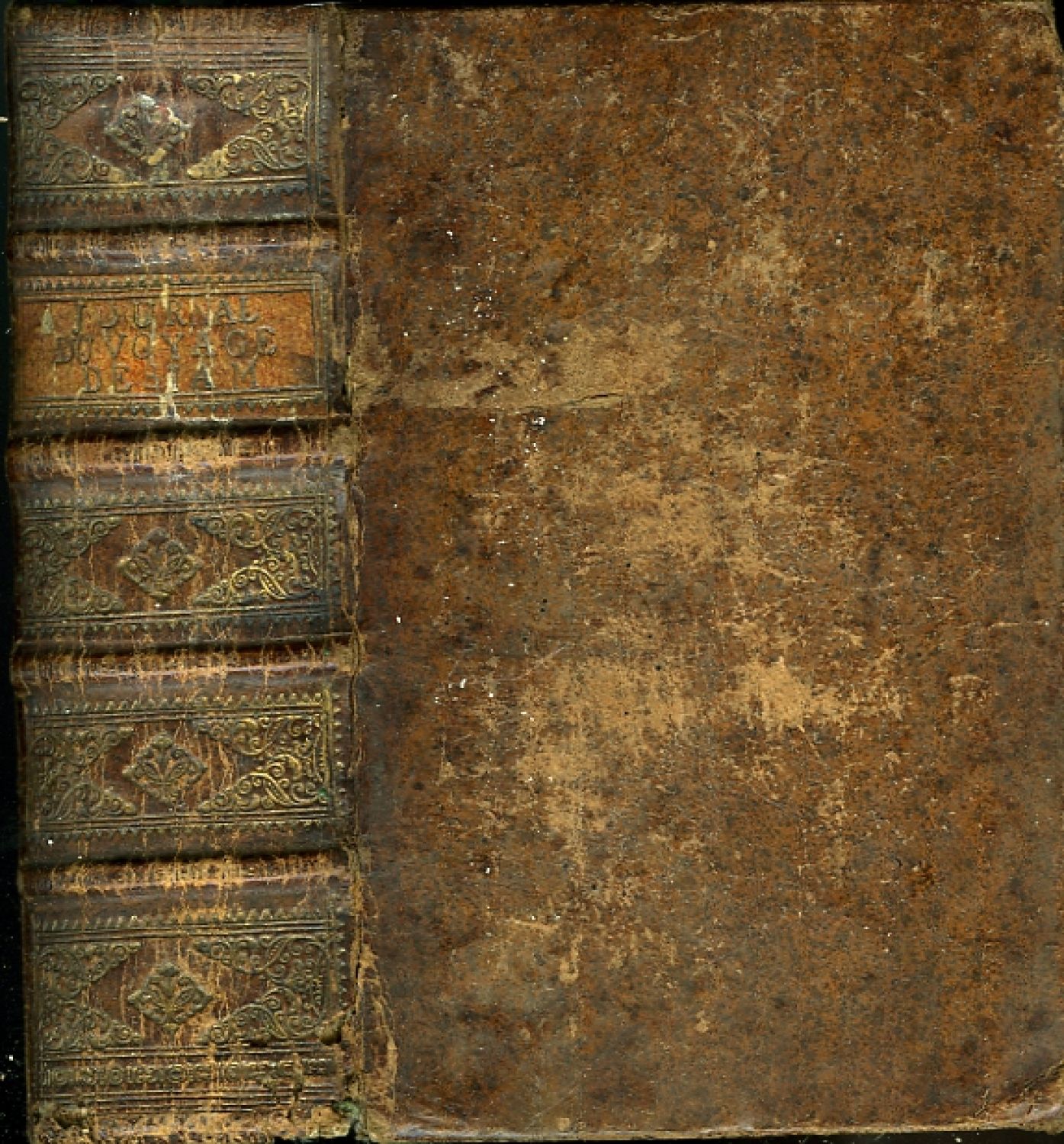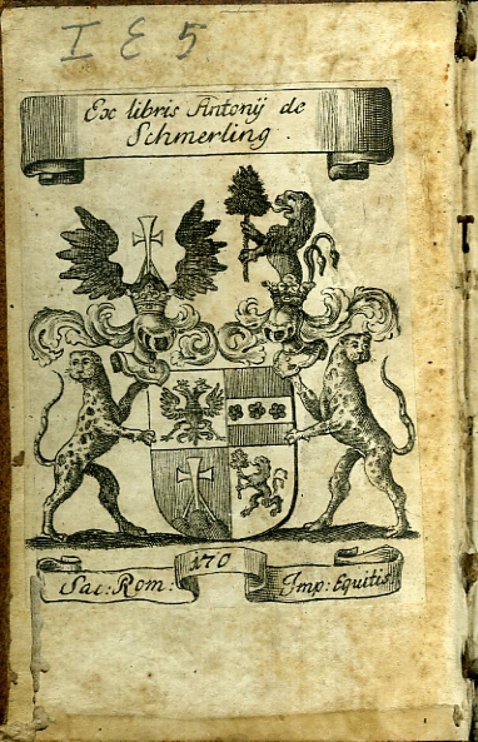 Dobová kožená vazba, ve hřbetu 4 vazy, ve druhém poli původní kožený štítek s tlačeným názvem, v ostatních polích tlačené zdobné ornamenty, barvené ořízky. Vazba ohmataná, desky odřené, spodní okraj hřbetu proděravělý. Na předním přídeští heraldické mědirytové "Ex libris Antonij de Schmerling" z 19. století.