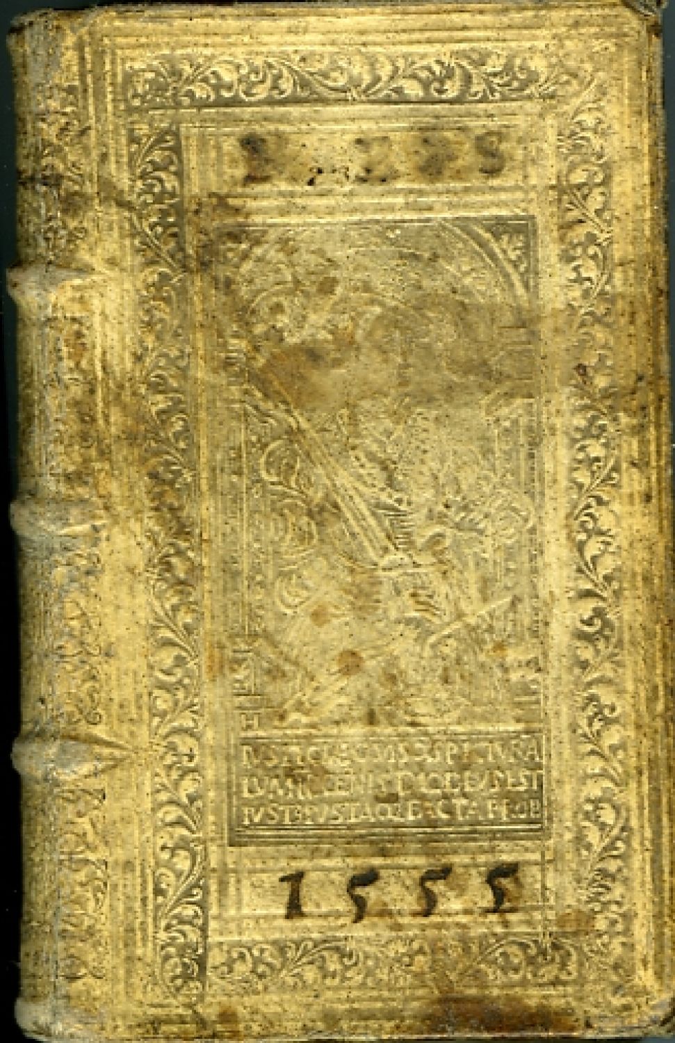 Dobová renesanční vazba ze světlé vepřovice zdobená slepotiskem. Na přední desce ve dvojitém rámu zdobeném rostlinným ornamentem alegorie spravedlnosti, pod ní vysvětlující latinský text. Pod horním okrajem rámu tlačený vlastnický záznam prvního vlastníka knihy I.E.S., při spodním okraji nad rámem tlačený letopočet 1555. Na desce zadní ve stejném rámu vyobrazení panovníka s dýkou a latinským vysvětlujícím textem. Na přední desce vazba signována monogramem HC. Ve hřbetu 5 vazů, v prvém poli rukou psaný název. Barvené ořízky. Vazba ohmataná, knižní blok zčásti rozevřený. Na předním přídeští nalepeno ex libris, částečně utržené, s iniciálami G.C.K., na přední předsádce rkp. záznam o provenienci z 19. století (piaristická kolej sv Augustina, titulní list zahnědlý.