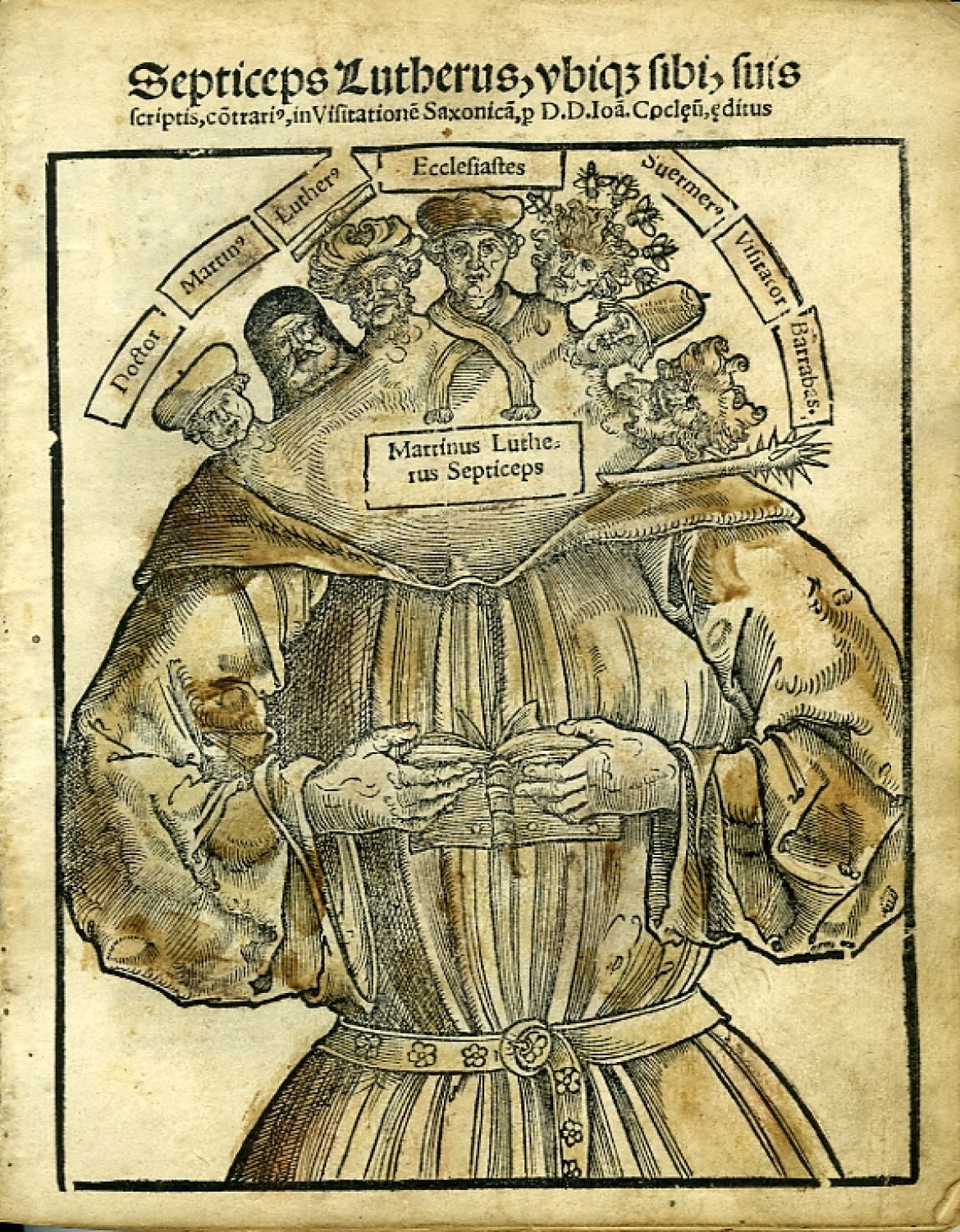 Johannes Cochlaeus, (vl. jménem Dobeneck, 1479-1552), německý humanista, theolog a jeden z nejzapálenějších Lutherových protivníků, autor více než dvou set protireformních spisů, vydal "Sedmihlavého Luthera" ve třech odlišných versích: latinsky (naše vydání) a ve dvou částečných německých překladech. Titulní listy všech tří versí obsahují dřevořez připisovaný malíři, mědirytci a dřevořezbáři Hansi Brosamerovi (cca 1500 Fulda? - cca 1554 Erfurt). Reformovaní se ihned následující rok revanšovali letákem "Siebenhäuptiges Papsttier".