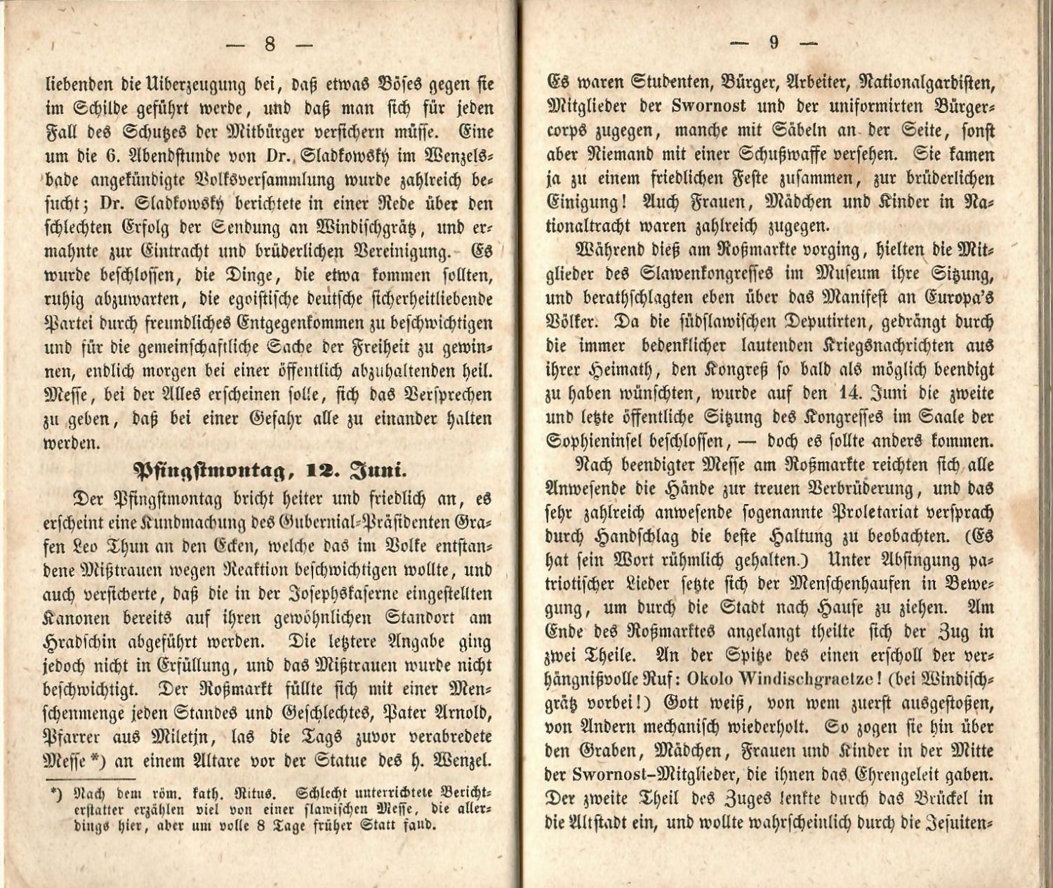 Tištěno švabachem, česká slova antikvou, tištěné poznámky pod čarou. - Kniha popisuje pražské červnové (svatodušní) povstání, které proběhlo 12. až 17. června roku 1848.