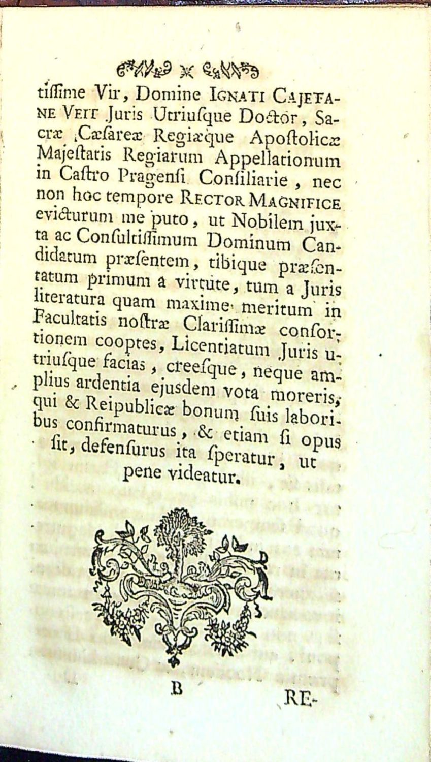 Uprostřed horního okraje drobné tiskařské ozdůbky, signatury, stránkové kustody, nepaginováno. Vstupní vlys s postavou putta (amoreta) s knihami v rámu z prolamovaných skořápek a škeblí, tučně tištěné versálky olemované ze tří stran rokokovými ilustracemi, rokokové viněty.
