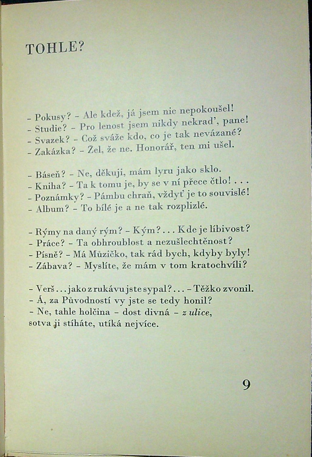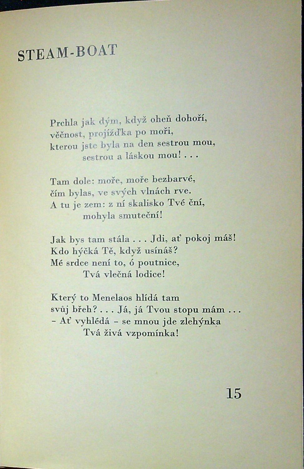 Ex. č. 11 z 20 výtisků přednostního vydání tištěného na imitaci japanu (vyšlo též 20 ex. na papíře Vergé Blanc). Přeložil Jindřich Hořejší, kromě básní "Epitaf" a "Paria", které jsou v překladu Viktora Dyka a rondelů "Sonet pohřební" a "Rákosová píšťalka" v překladu Jana Zahradníčka. - Vazba ze světle červeně barvených desek a červeným koženým hřbetem, ve hřbetu tlačený a zlacený název, zlacená svrchní ořízka. Vázal knihvazač Jenda Rajman z Rožďalovic.