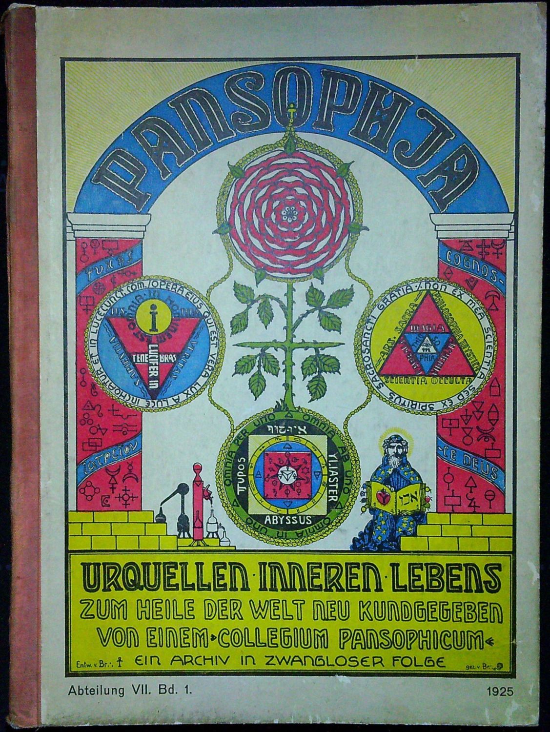 Na přední straně vazby je vyznačeno Abteilung VII., Bd. 1. (ve skutečnosti se jedná o 4. svazek z 12 vydaných svazků Pansophia-Verlag). - "Collegium Pansophicum" založili roku 1921 Heinrich Tränker a Karl Germer. Heinrich Tränker (6.8. 1880 - 22.5. 1956), rosenkrucián, antikvář, okultista a teosof, vystupující pod jmény Frater Recnartus, Garuda a Henkelkreuzmann. Již za první světové války založil v Lipsku Pansofickou lóži. V roce 1925 se seznámil s Alaisterem Crowleyem, kterým byl nejprve fascinován, ale poté co se Crowley prohlásil za spasitele světa došlo mezi nimi k zásadnímu rozkolu, Crowley prohlásil Tränkera za Jidáše a Pansofická společnost byla 1. dubna roku 1926 rozpuštěna.