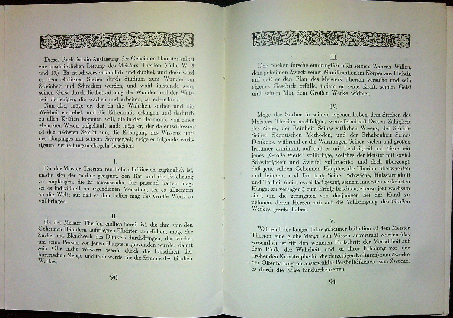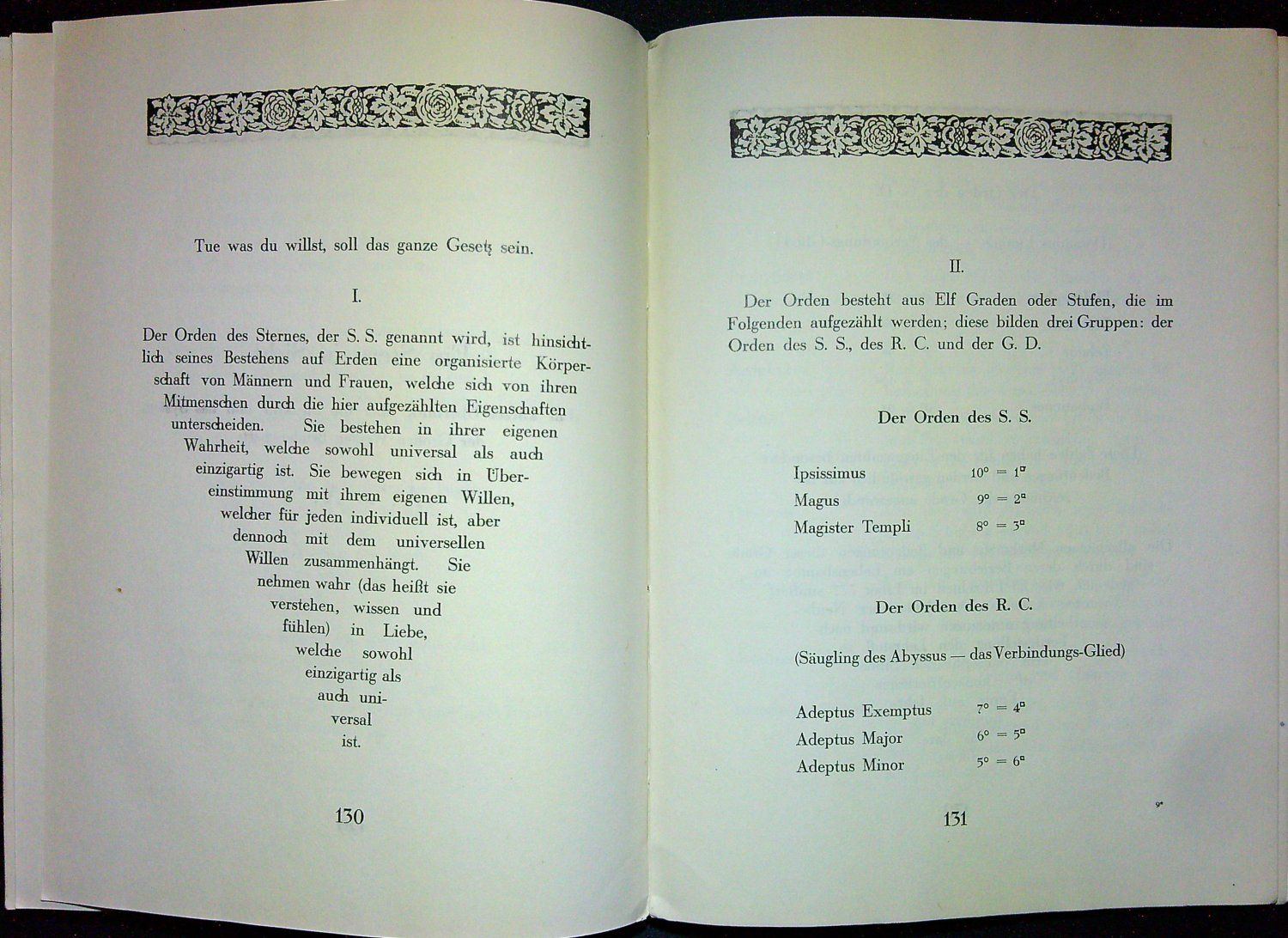 Exemplář číslo 737 z neudaného počtu vydaných. V záhlaví stran pásové lišty zdobené rostlinným ornamentem, předtitul zasazený v borduře zdobené různými okultními emblémy, viněty, titulní listy jednotlivých pojednání v rámečku z ornamentů (celkem devět), na straně 93 je pojednání "Das Herz des Meisters" od Khaled Khana, ve skutečnosti od A. Crowleyho, které autor napsal roku 1924 a anglicky bylo publikováno až v roce 1938. Kniha dále obsahuje: "Liber II. Die Botschft des Meisters Therion"; "LXI vel Cause"; "Postkarten an Lehrlinge"; "Liber III vel Jugorum"; "Liber H H H sub. Figura CCCXLI"; "AHA!"; "Der Meister Therion"; "Ein Stern in Sicht" und "Kleine Mitteilungen". V úvodu díla je předmluva vydavatele A. Fra. Recnartuse (= Heinrich Tränker). - Původní kartonová vazba s barevnou ilustrací na přední straně, plátěný hřbet. Vazba lehce zaprášená.