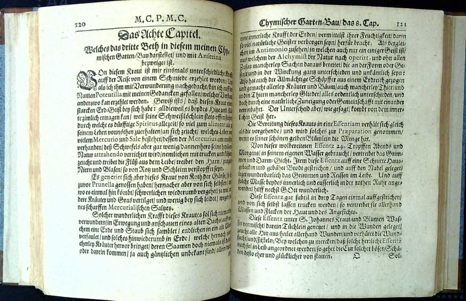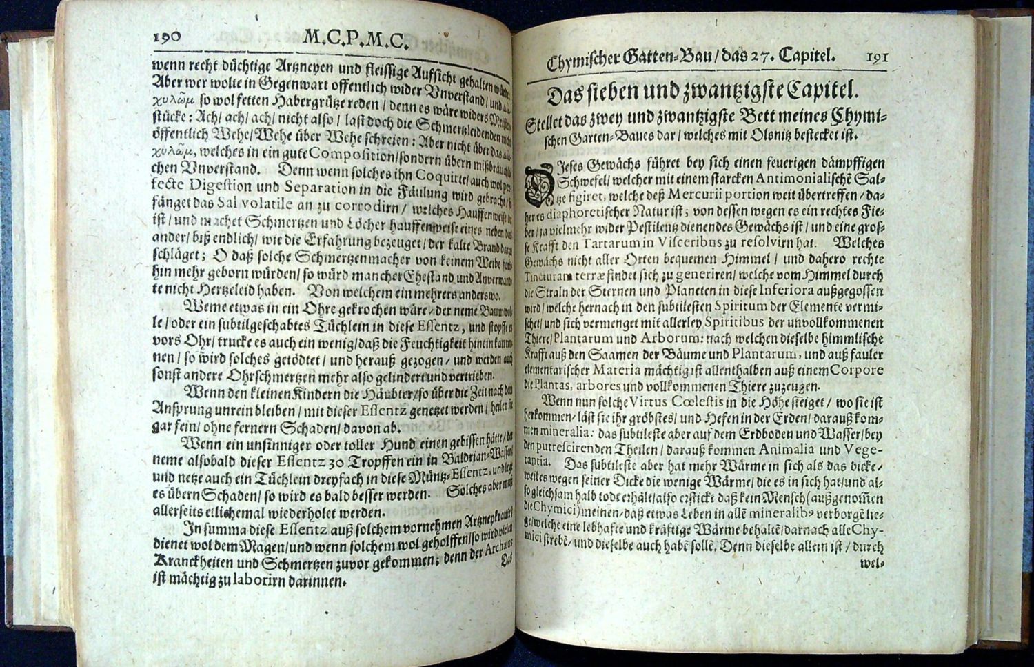 Neuer Halblederband auf drei Bünden, neue Vorsätze, es fehlt Portrait-Frontispiz. Fachmännisch restauriertes Exemplar, einige Fehlstellen (meistens an den Rändern) ergänzt. Titel etwas beschmutz, mit Besitzvermerk. Gutes Exemplar dieses seltenen Werks. Erste Ausgabe einer hermetischen Schrift von Michael Crügner, der ein berühmter Dresdener Artz und Spagyriker war. Hinter dem Titel 12- seitige Widmungsschrift des Verfassers für Jahann Georg Herzog zu Sachsen. Der Verfasser entwickelte in seinen zahlreichen Werken ein System der hermetischen und spagyrischen Heilkunde und beschreibt nicht nur das Sammeln von Heilpflanzen sondern auch zahllose Therapievorschläge und mannigfaltige Rezepte für Elixiere, Essenzen usw. Ganz besonderen Wert legt Crügner auch auf astrologische Details. Die Haliographie (eigener Titel ab S. 231) ist eine Beschreibung der verschiedenen Salzmineralien, d. h. der bei Verbrennung von Pflanzenübrigbleibenden festen Stoffe.