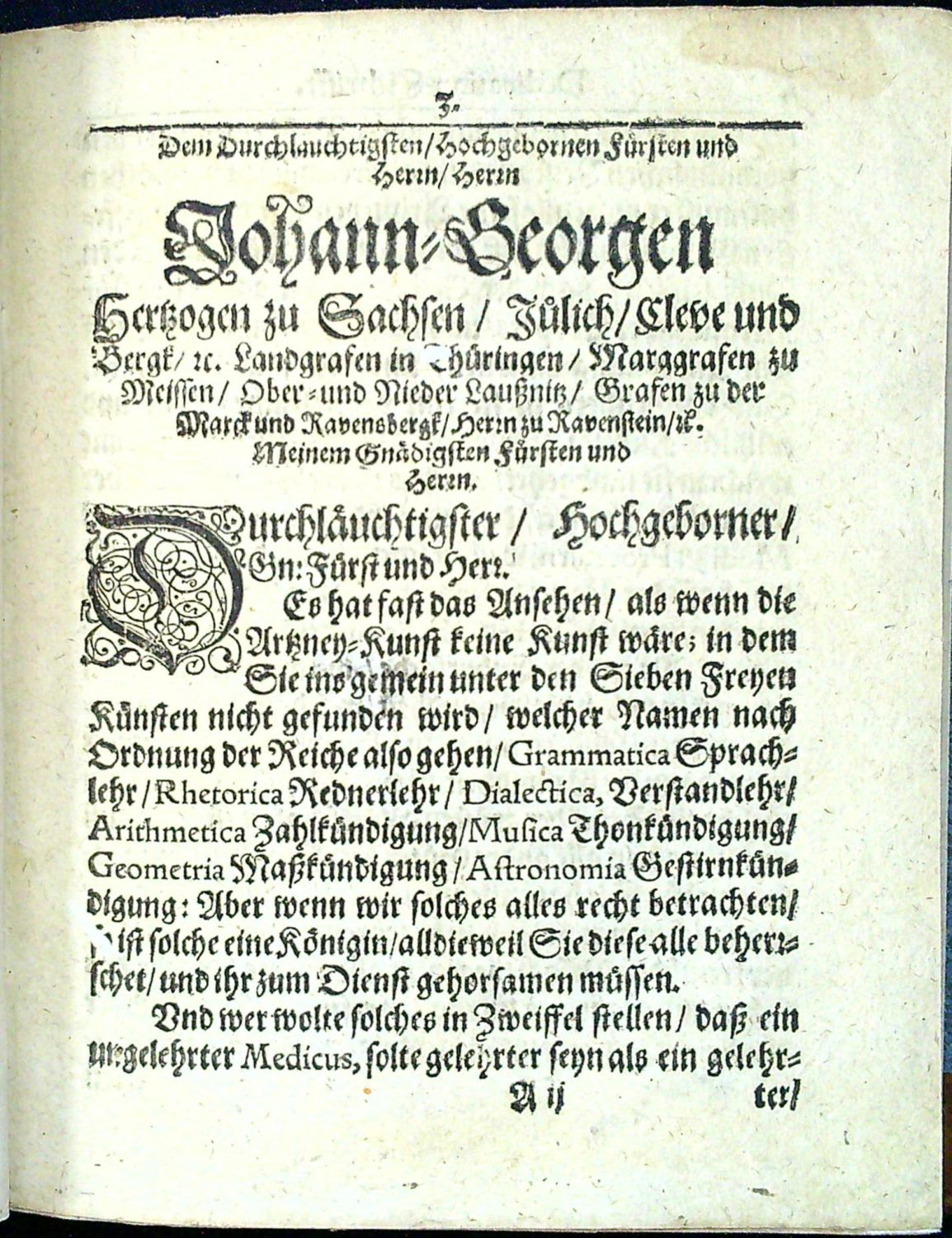 Za titulním listem autorova dedikace saskému vévodovi Johannu Georgovi. První vydání vzácného hermetického spisu Michaela Crügnera, lékaře v Drážďanech.