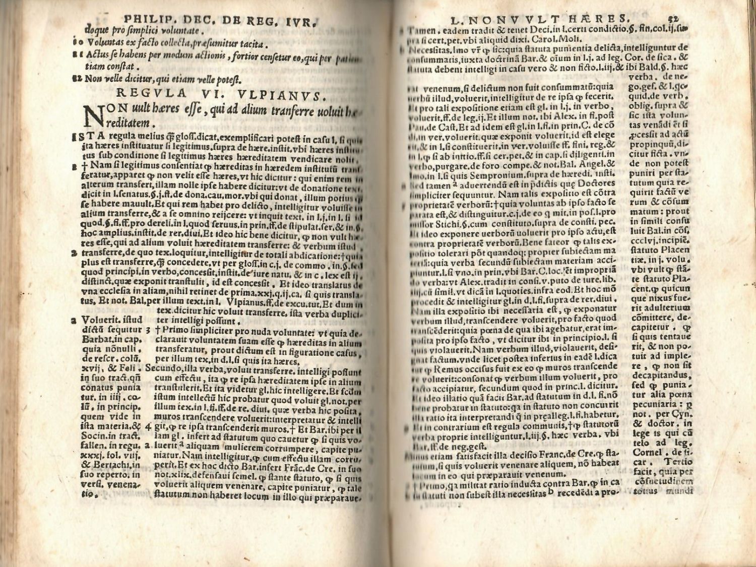 + přívazek: "DYNI (= Dino del Mugello) COMMEN. IN REGVLAS IURIS. PRAESTANTISSIMI iuris vtrisque Docto. Dyni Muxellani uberrimus Commentarius in Regulas Iuris Pontificij, Legalis discipline studiosis vtilissimus, Anotamentis Domini Nicolai Boërij (= Nicolas de Bohier) Regij Co[n]siliarij & Praesidis in Senatu Burdegale[n]si dilige[n]ter illustratus, ac quam plurimis, quae hactenus corrupta fuerat, neperimme suo nitori restitutis, emendatior redditus. Index Alphabeticus operi no[n] inuenuste praefixus est". Lugduni (Lyon), Jacob Guinta, 1548, 132 + 20 listů. Na tit. listu drobná viněta, v závěru signet nakladatelův, konturové iniciály na rostlinném i ilustr. pozadí zalomené do výše 3-7 řádků, tisk ve dvou a třech sloupcích (vlastní text uprostřed, či při vnitřním okraji olemovaný tištěnými poznámkami. (KVK neeviduje, WorldCat eviduje 1 ex. na universitě v Illinois).