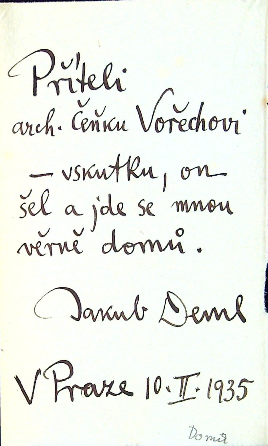 Jeden ze 200 exemlářů tištěných na ručním papíře (krom toho bylo vytištěno 300 ex. na antiku). Dvoubarevně tištěný tit. list s dřevorytovou vinětou, knižní blok neoříznutý. Na rubu patitulu podpis Demlův, vložen druhý patitul s rkp. dedikací "Příteli arch. Čeňku Vořechovi - vskutku, on šel a jde se mnou věrně domů. Jakub Deml V Praze 10.II.1935".