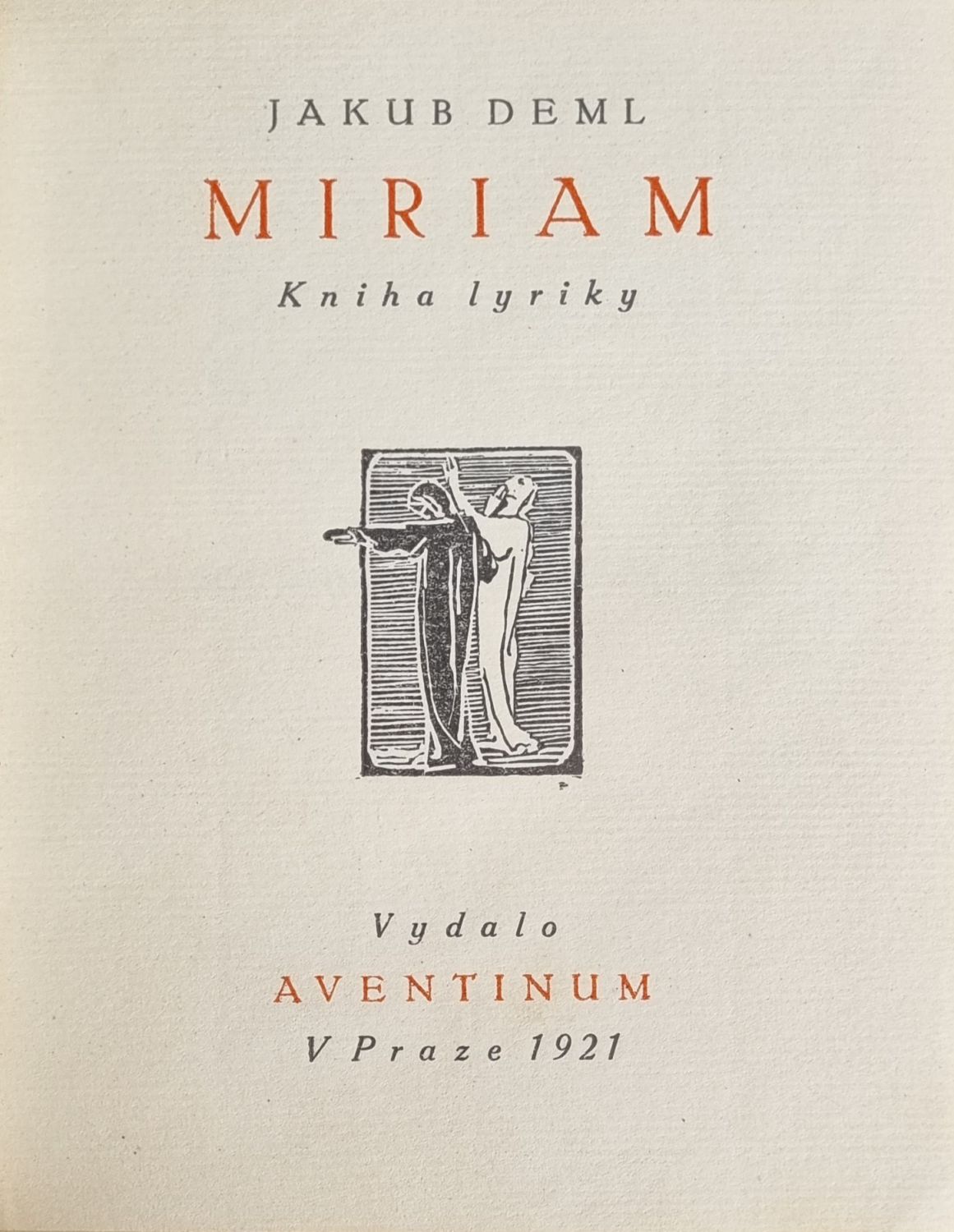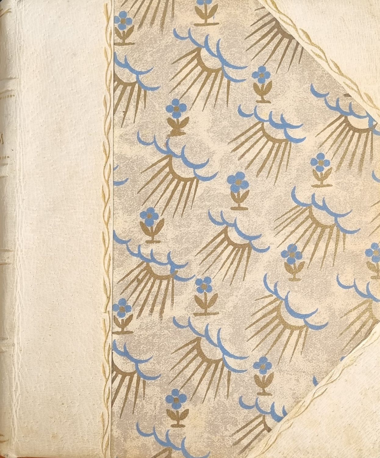 Dvoubarevně tištěný titulní list. V úpravě Svatopluka Klíra vytiskl František Obzina ve Vyškově na imitaci ručního, jemnějšího rýhovaného papíru. - Dobová individuální vazba s kartonovými deskami potaženými olejovým papírem zdobeným modrým a zlaceným ornamentálním dekorem, kožený hřbet a nárožnice ze světlé hlazené vepřovice od pap. pokryvu odděělené zlacenou prolamovanou dvoulinkou, ve hřbetu 4 vazy, ve druhém poli tlačený a zlacený název, v polích ostatních ozdůbky rostlinného charakteru, zlacená svrchní ořízka. Přední strana pův. obálky vevázána.