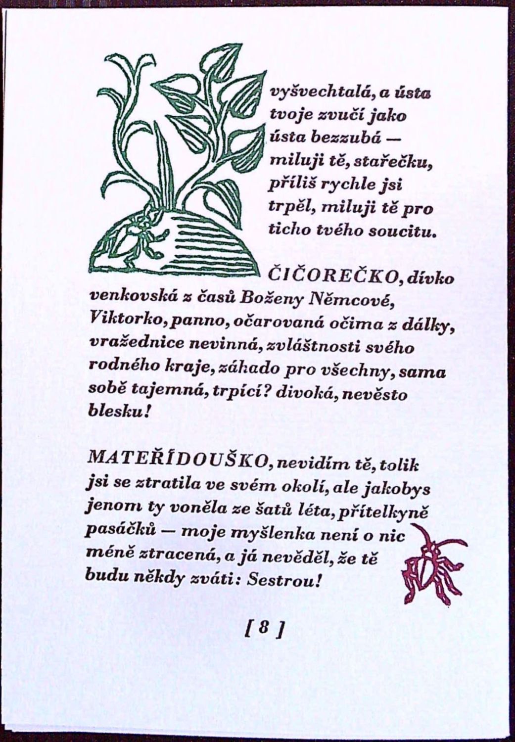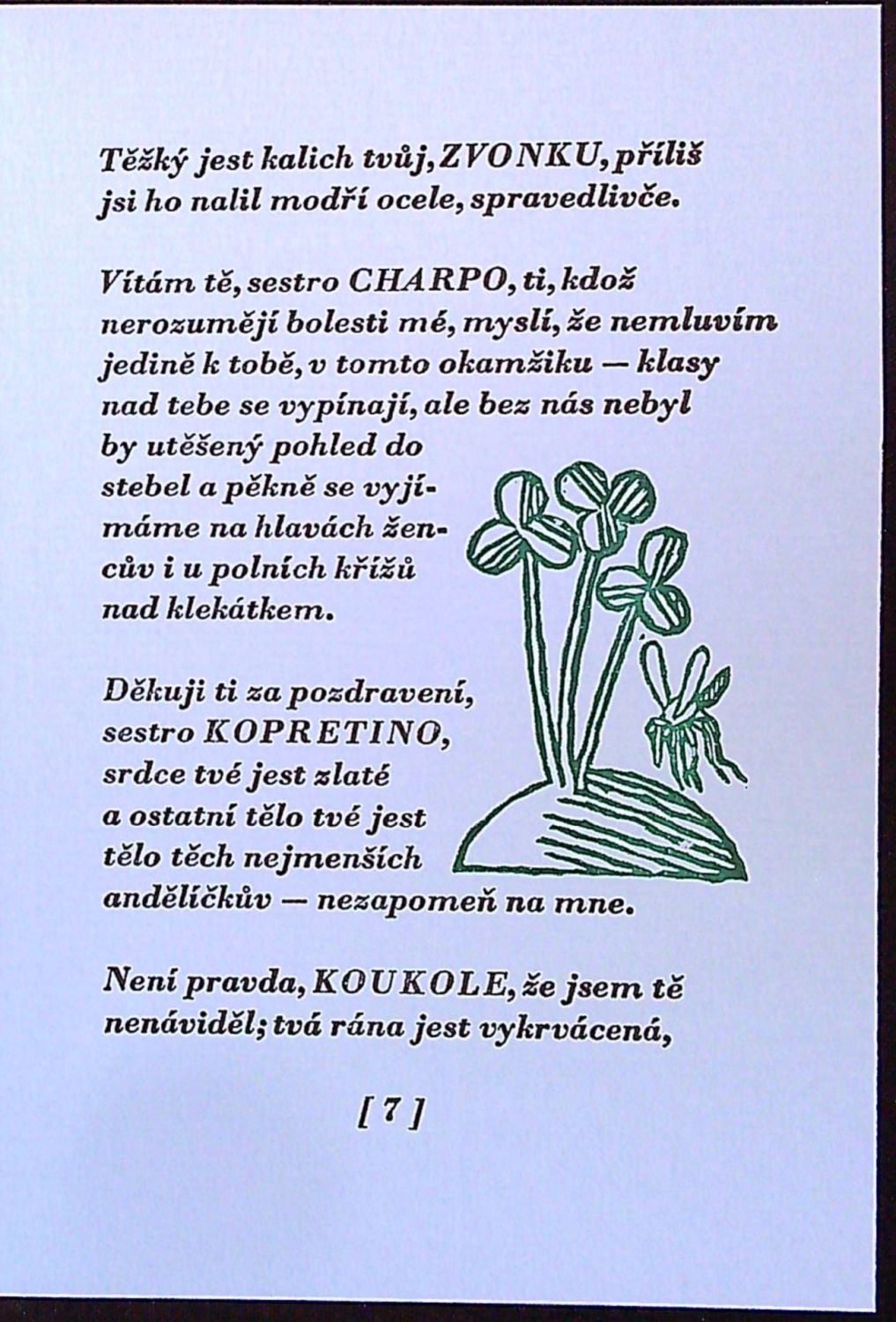 Jeden ze 48 výtisků, které písmem Bodoni kurzíva polotučná na papír Conqueror na ručním lisu vytiskl Jan Juránek. V textu několik menších linorytů (snad od Zdirada Čecha).