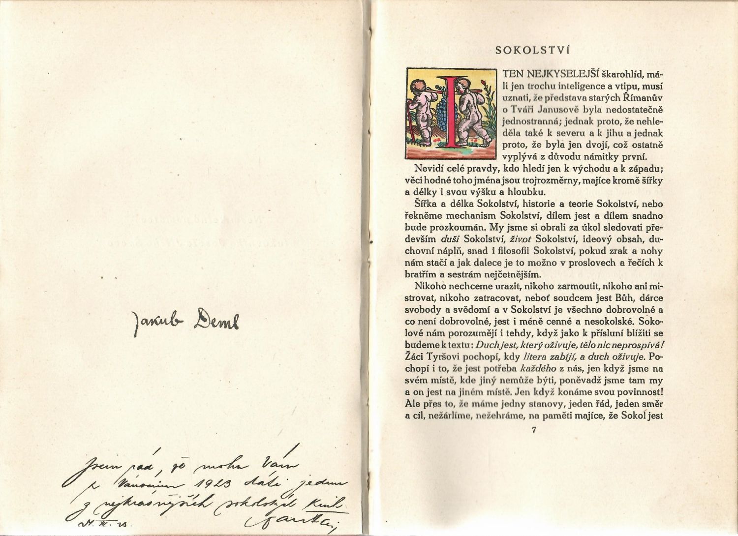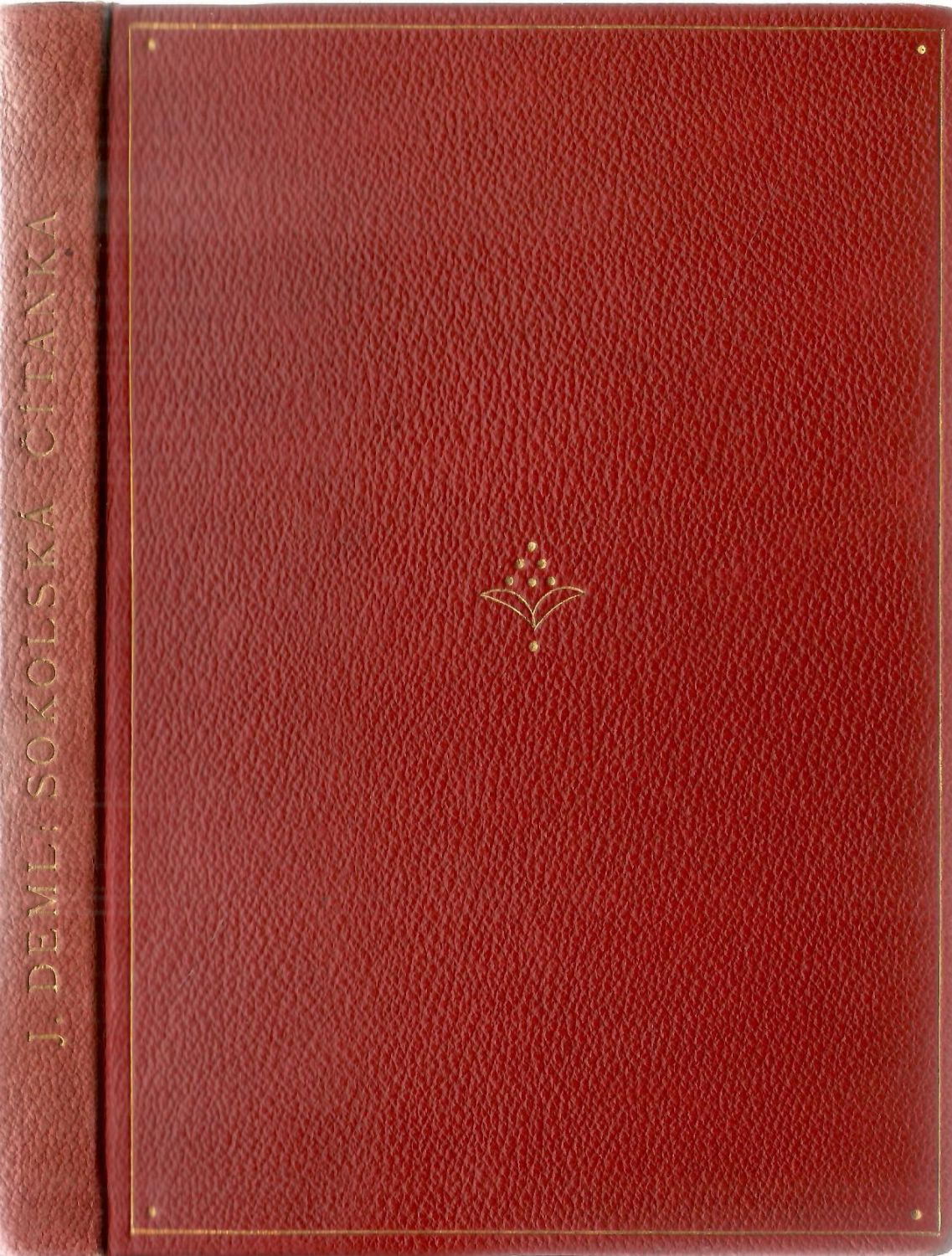 Na rubu tit. listu autorův podpis černým perem, při spodním okraji dedikace neurčeného dárce "Jsem rád, že mohu Vám k Vánocům 1923 dáti jednu z nejkrásnějších sokolských knih ?". - Dobová vazba z červeně barvené vepřovice, na obou deskách tlačený rám z jednoduché zlacené linky, uprostřed rámu drobná tlačená, zlacená ozdůbka, přes hřbet tlačený a zlacený název, zlacená svrchní ořízka. Přední strana pův. pap. obálky vevázána.