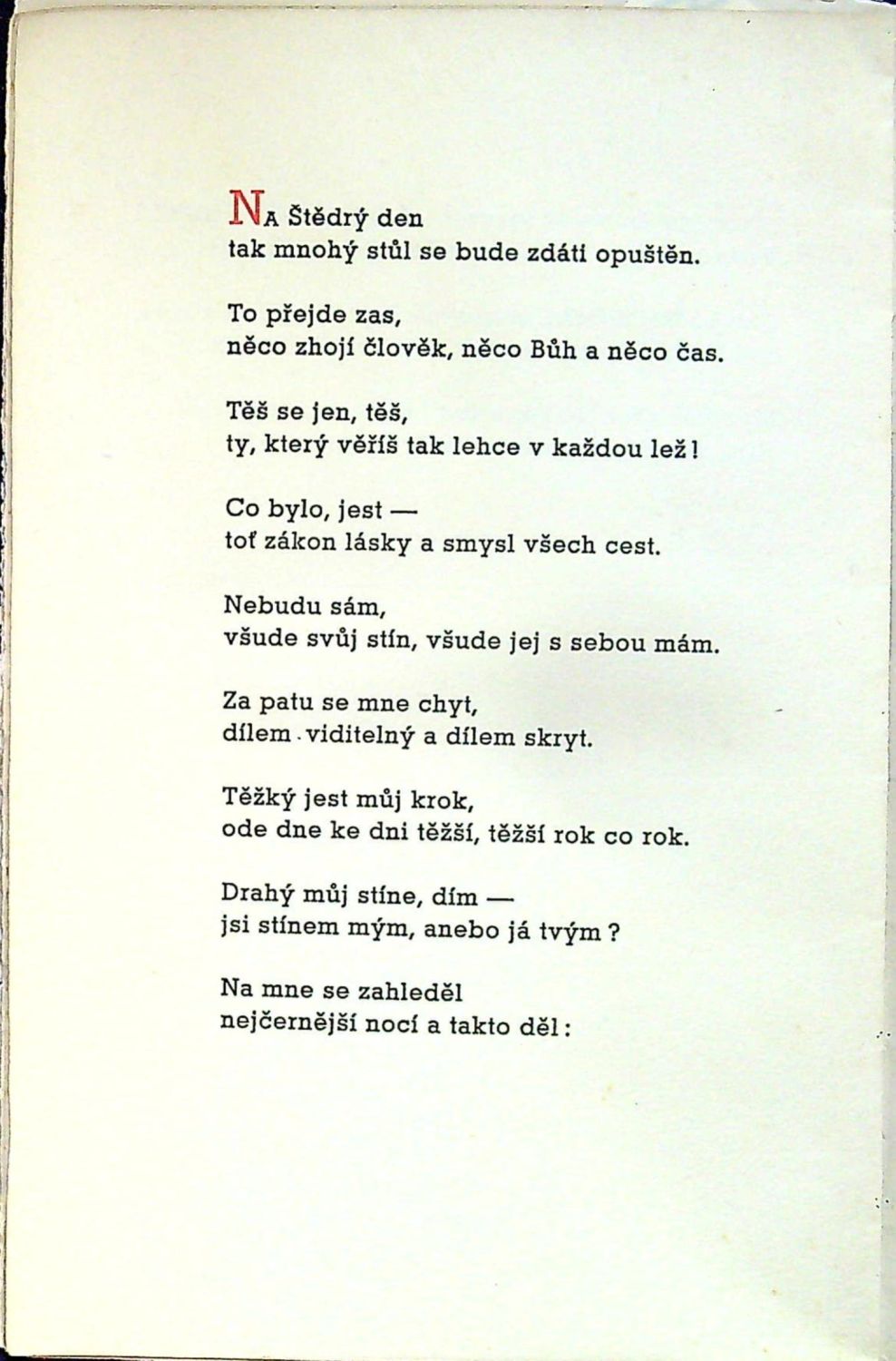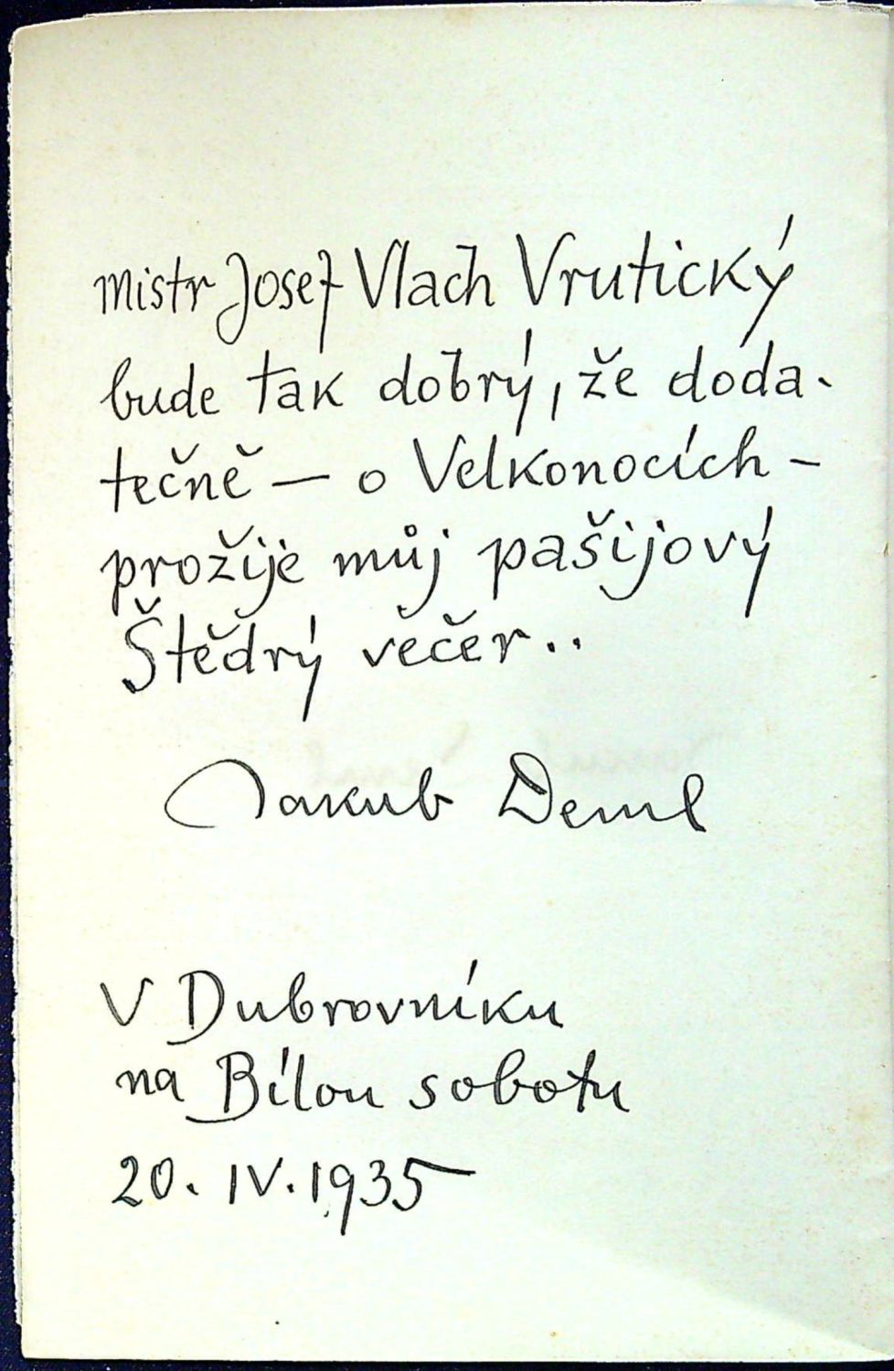 Pro své přátele k Vánocům 1934 vydal sám autor ve 300 exemplářích, vytiskla Dyrynkova tiskárna K. Reyl v Praze. Částečně dvoubarevný tisk. - Nepůvodní pap. obálka, ve které je volně vložený bílou nití šitý knižní blok, poslední tištěný list s tiráží částečně zašpiněný. Na stránce s červeně tištěným přáním podpis autorův černým perem, na rubu rkp. přípis černým perem "Mistr Josef Vlach Vrutický bude tak dobrý, že dodatečně - o Velikonocích - prožije můj pašijový Štědrý večer.. Jakub Deml V Dubrovníku na Bílou sobotu 20.IV. 1935". Volně vložený útržek papíru s Demlovým rkp. textem podoby tiráže.