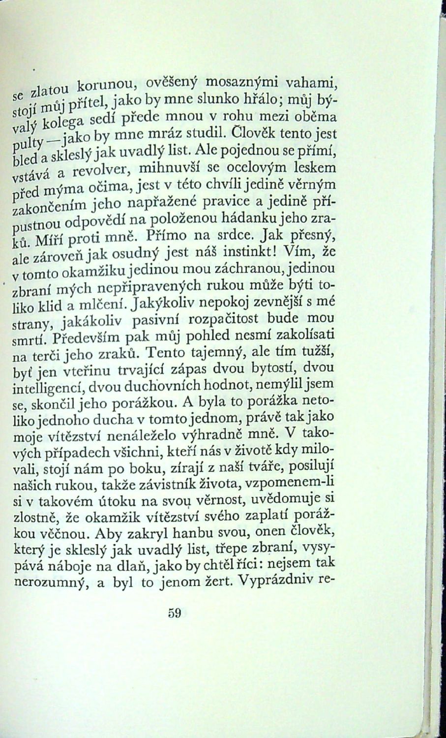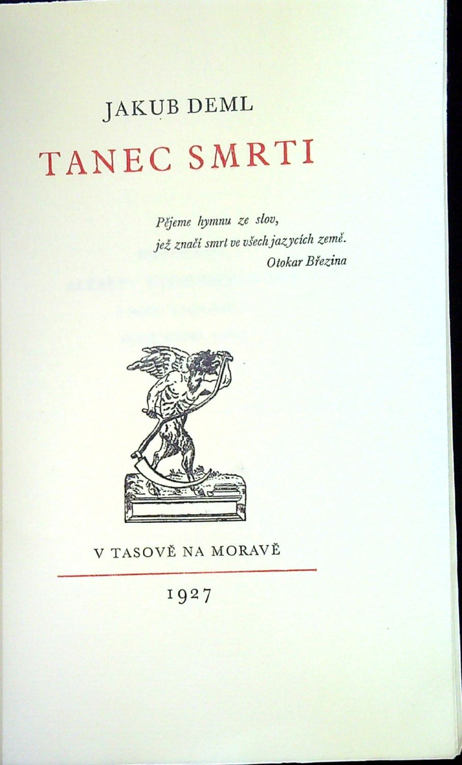 Jeden z 500 vydaných exemplářů, které písmem Cicero Baskerville vytiskla Lidová knihtiskárna A. Němec v Praze. Dvoubarevně tištěný tit. list s vinětou.