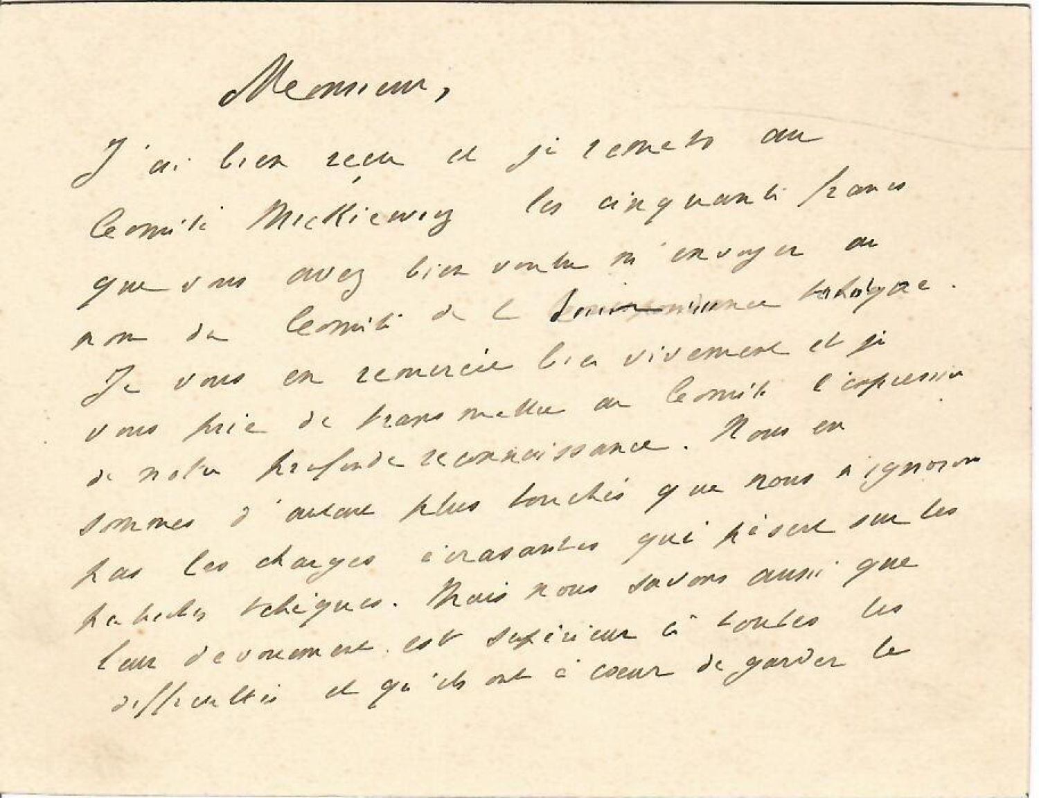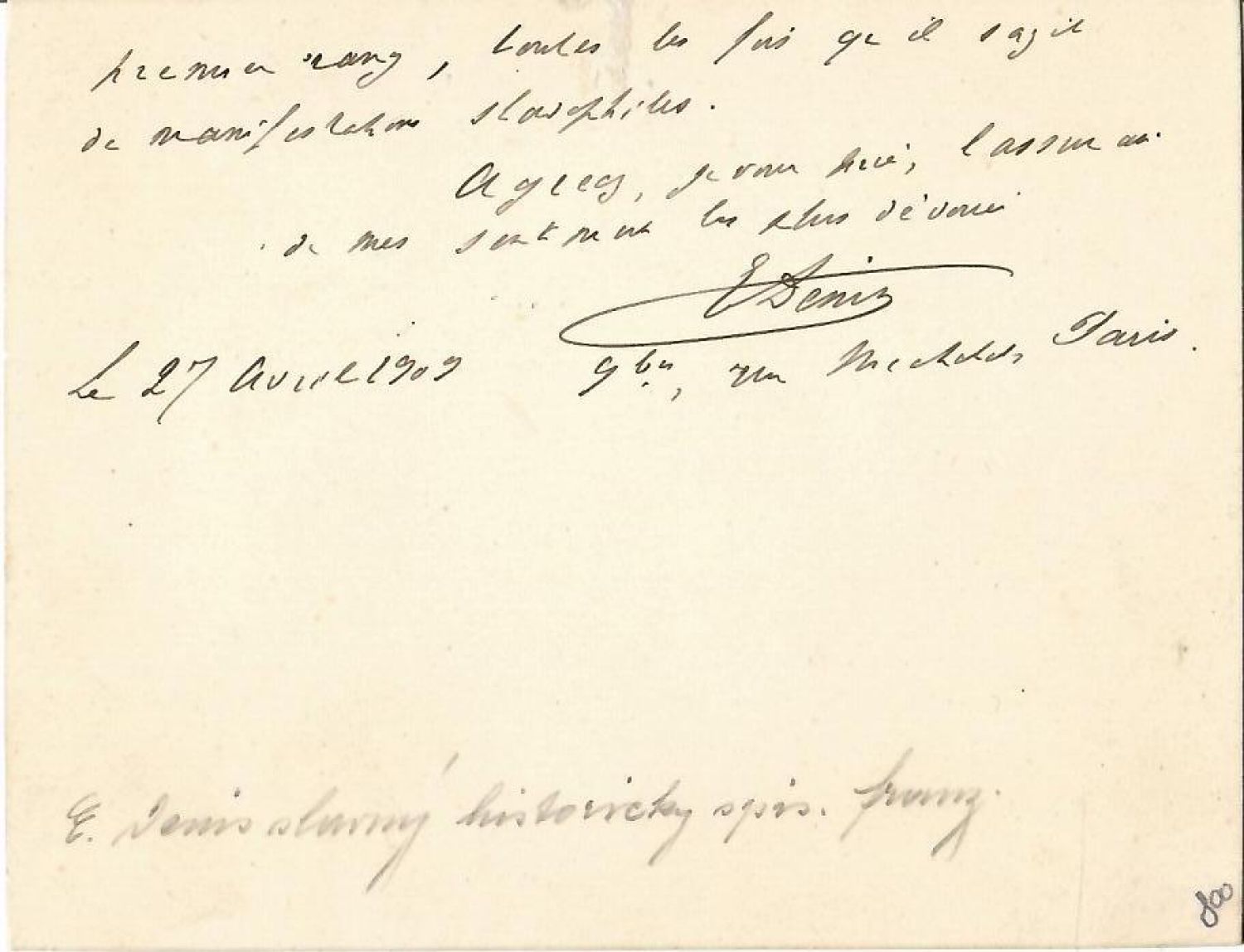 List tužšího papíru 9 x 11,5 cm, oboustranně popsaný černým inkoustem, podepsán a datován 27.8.1909 v Paříži. - Pisatel děkuje neuvedeným pánům v Čechách za zaslání padesáti franků jménem "Comité Mickiewicz"(?). - Ernest Denis (1849 Nîmes – 1921 Paříž), francouzský historik, politik, slavista a především bohemista, profesor na univerzitách v Bordeaux a na pařížské Sorboně. Je autorem mnoha děl o politických a kulturních dějinách Čechů, ale i dalších slovanských národů.