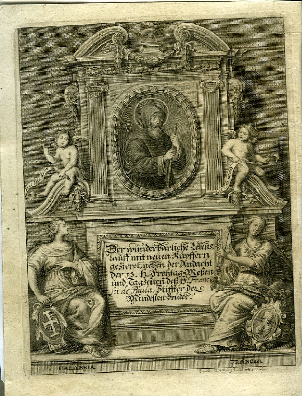 Der Wunderthätige Lebenslauff Dess Heiligen und grossen Patriarchen FRANCISCI DE PAULA, Stüffter dess heiligen Ordens MINIMORUM, Oder der Mindisten Brüder/ Auffs neue übersehen/ und mit beygetruckten Kupferstichen in Truck verfertiget/ Sambt der Regul dess dritten Ordens beyder Geschlechten/ und der Andacht der H. XIII. Freytag=Wessen/ und geweyhten Kertzen; So dann Den Tagzeiten/ Litaney/ Gebettlein und Gesängern Zu dem Heiligen Ordens=Stüffter.