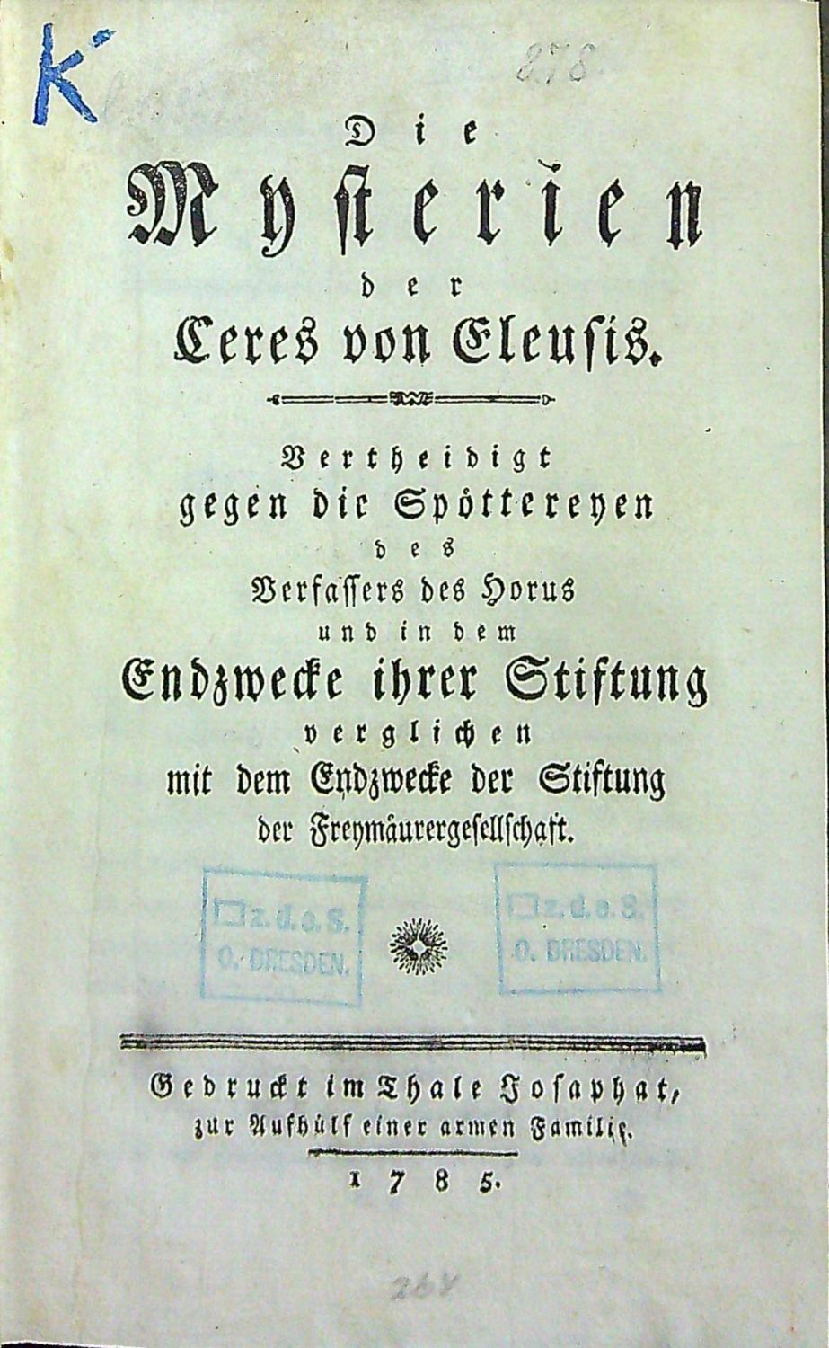 Die Mysterien dere Ceres von Eleusis. Vertheidigt gegen die Spöttereyen des Verfassers des Horus und in dem Endzwecke ihrer Stiftung verglichen mit dem Endzwecke der Stiftung der Freymäurergesellschaft.