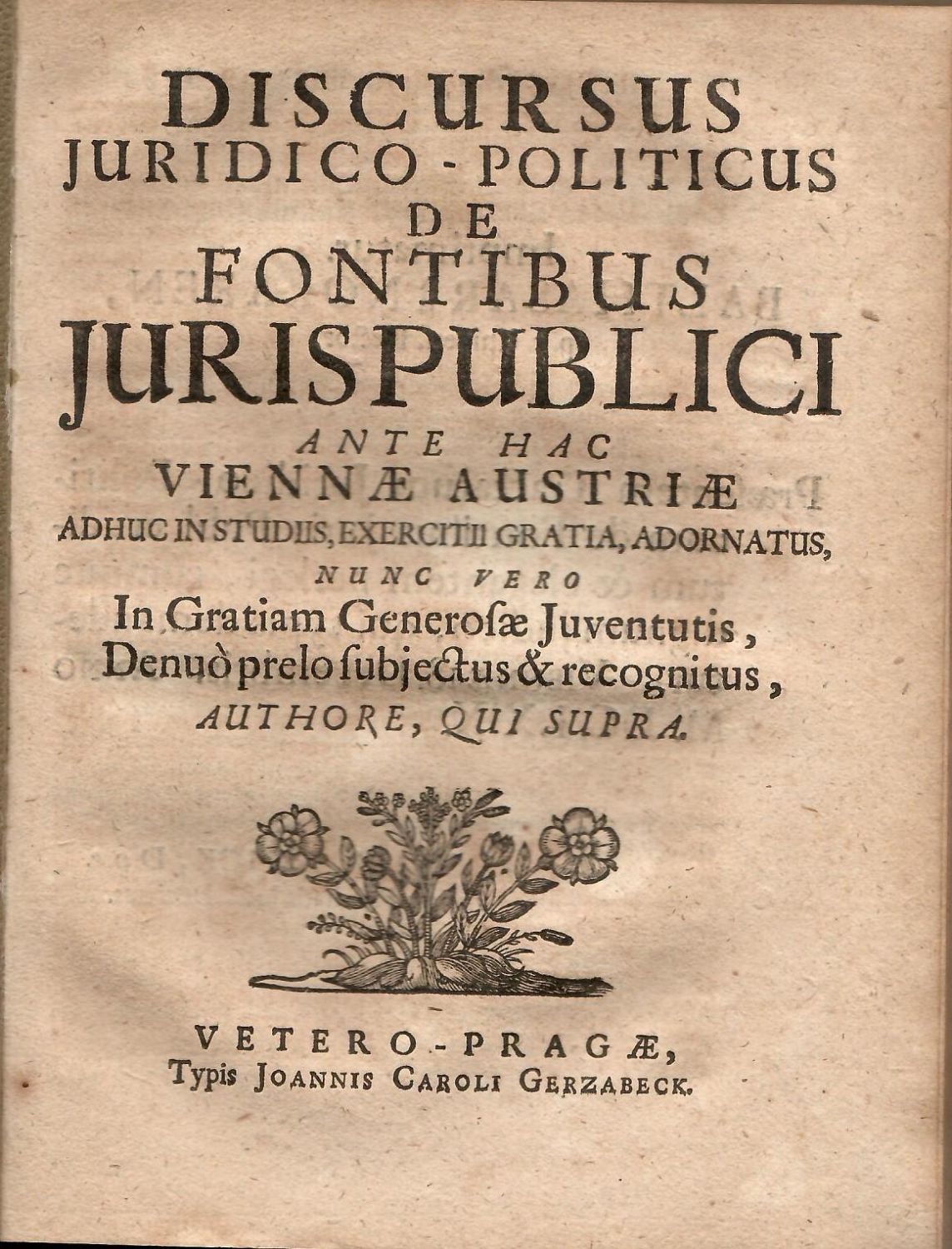 DISCURSUS JURIDICO - POLITICUS DE FONTIBUS JURIS PUBLICI ANTE HAC VIENNAE AUSTRIAE ADHUC IN STUDIIS, EXERCITII GRATIA, ADORNATUS, NUNC VERO In Gratiam Generosae Juventutis, Denuo prelo subjectus & recognitus, AUTHORE, QUI SUPRA.
