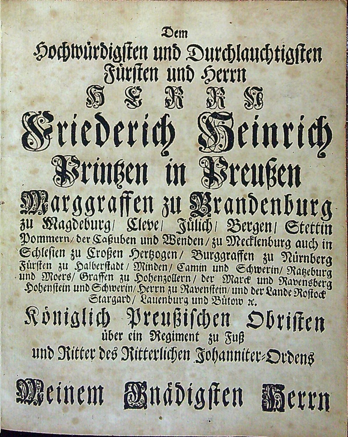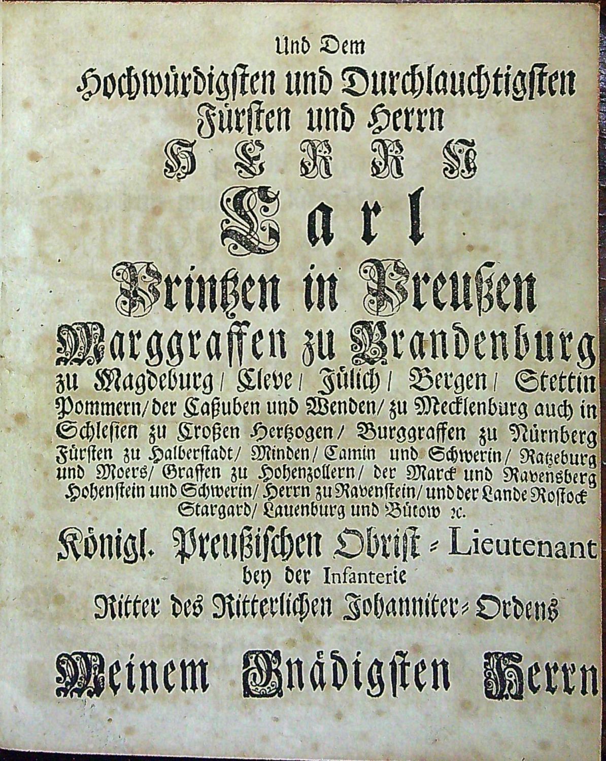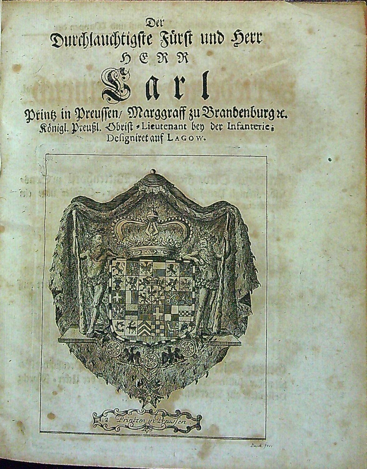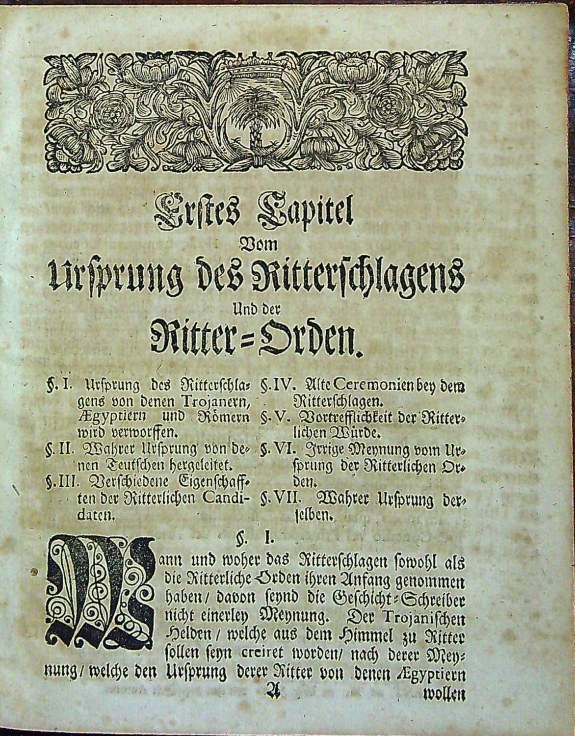 Geschichte Des Ritterlichen Johanniter=Orden Und dessen Herren=Meisterthums In der Marck/ Sachsen/ Pommern und Wendland Worinn des am VII. April dieses Jahrs gehaltenen Ritter=Schlags SOLENNITAETEN Verzeichniss der investirten Ritter und derselben Stamm=Wappen wie auch Ursprung des Ritterschlagens und Ritterlichen Orden Anmerckungen von Ordens=Creutz Herrn Abt de Vertot ins Teutsche übersetzte Dissertation vom alten und neuen Gouvernement des Johanniter=Ordens enthalten und beschrieben von ......