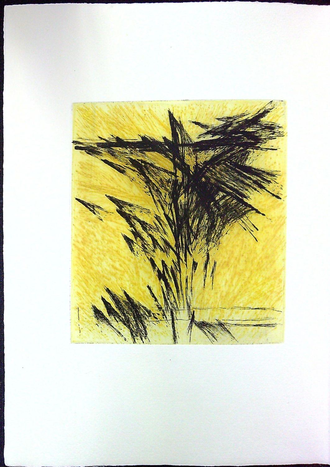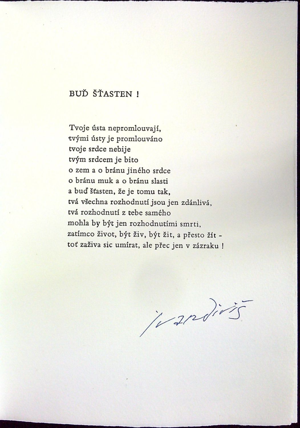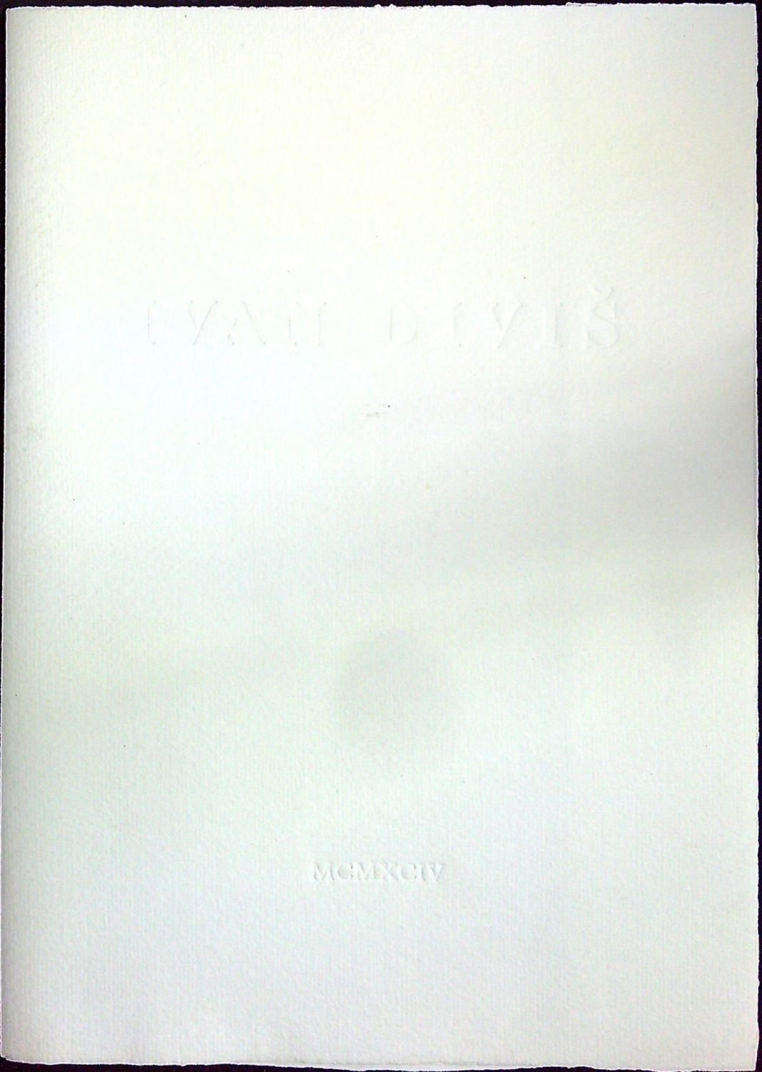 Ex. č. 28 ze 30 vydaných, které k autorovým sedmdesátinám vydal a suchou jehlou doprovodil Emanuel Ranný na ručním papíře z Velkých Losin (krom toho 10 výtisků na papíru Zerkall Bütten). Na vnitřní straně levé části dvoulistu suchá jehla (150x140 mm) na pravé Divišova báseň autorem perem podepsaná. - Dvoulist volně vložený v původní pap. obálce z losínského papíru.