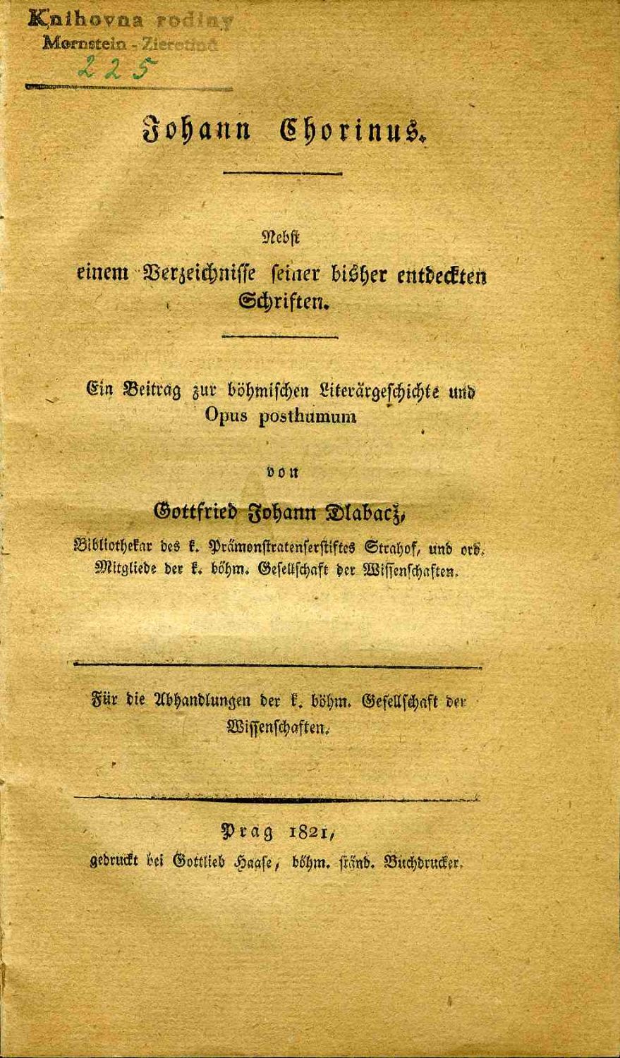 Johann Chorinus. Nebst einem Verzeichnisse seiner bisher entdeckten Schriften. Ein Beitrag zur böhmischen Literärgeschichte und Opus posthumum von ...