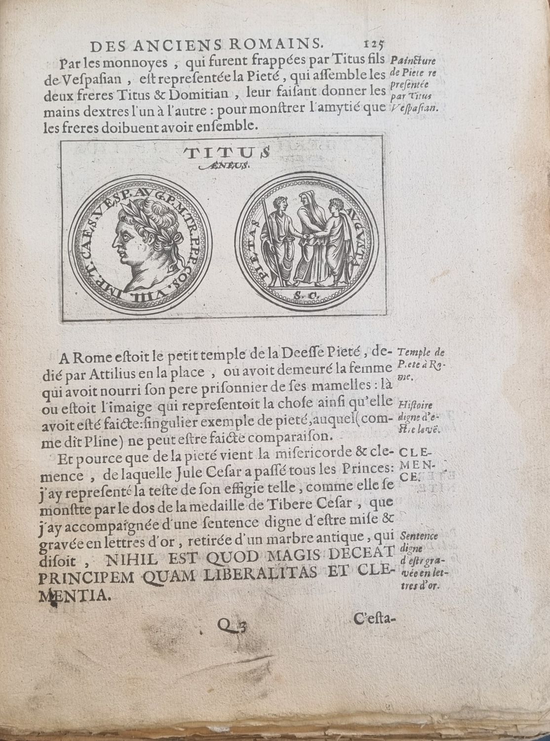 Mědirytinový frontispis, na tit. listu do mědi rytá viněta, v textu 207 mědirytin s vyobrazením 483 antických mincí a medailí, 41 mědiryt. ilustrací a 17 celostr. mědirytin (se 70 vyobrazeními mincí a medailí a 5 vyobrazeními antických chrámů a náboženských obřadů. Iniciály na dřevořezovém ilustr. pozadí ve výši 6 řádků, vstupní pásový vlys, tučně tištěné versálky, tištěné poznámky po stranách, na několika místech v textu versálkami přetištěné nápisy z antické doby.