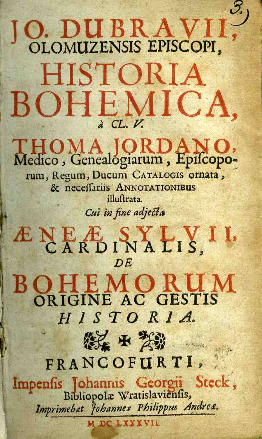 HISTORIA BOHEMICA, à CL. V. THOMA JORDANO, Medico, Genealogiarum, Episcoporum, Regum, Ducum CATALOGIS ornata, & necessariis ANNOTATIONIBUS illustrata. Cui in fine adjecta AENEAE SYLVII, CARDINALIS, DE BOHEMORUM ORIGINE AC GESTIS HISTORIA.