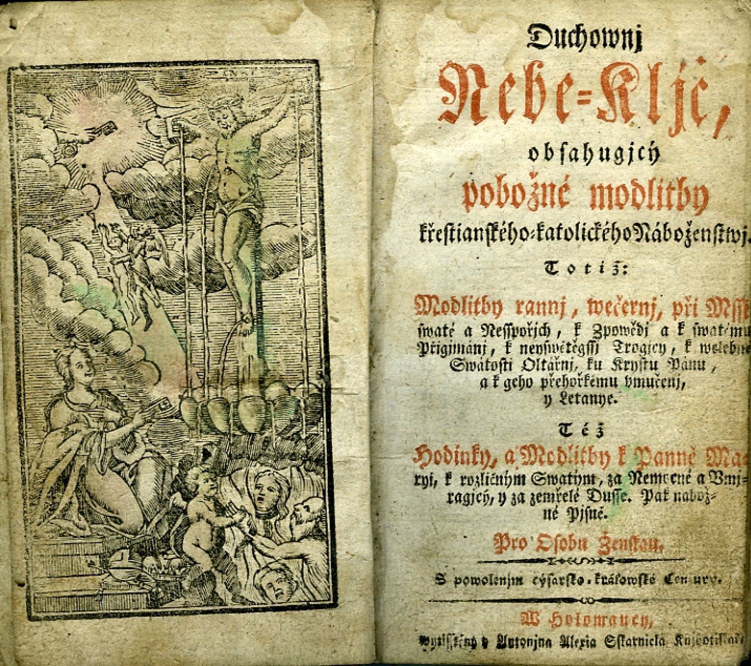 Duchownj Nebe=Kljč, obsahugjcý oibožné modlitby křestianského=katolického Náboženstwj. Totiž: Modlitby rannj, wečernj, při Mssi swaté a Nešpořjch, k Zpowědi a k swatému Přigjmánj, k neyswětěgssj Trogjcy, k welebné Swátosti Oltářnj, ku Krystu Pánu, a k geho přehořkému vmučenj, y Letanye. Též Hodinky, a Modlitby k Panně Maryi, k rozličným Swatým, za Nemocné a Vmjragjcý, y za zemřelé Dusse. Pak nabožné Pjsně. Pro Osobu Ženskau.
