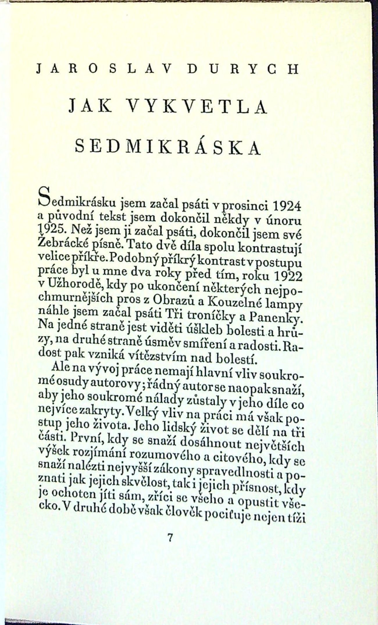 Ex. 10 z 20 výtisků přednostního vydání tištěného na ruční papír Tofa, vytiskli Müller a spol. v Turnově, v tiráži pod vytištěným "a byl věnován" Kuncířem napsáno J. Palivcovi, na patitulu podpis J. Durycha. - Knižní blok nerozřezaný.