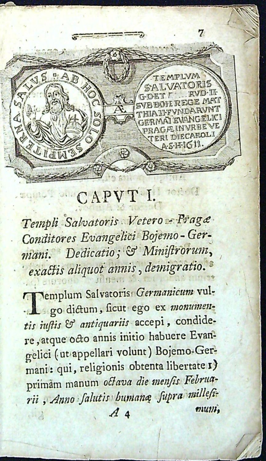 Chybí frontispis a dvě mědirytinové přílohy. Na str. 7 mědirytina v ozdobném rámci s girlandami (pamětní medaile z r. 1611). Na titulním listu a rubu obálky provenienční záznamy inkoustem, u tit. listu utržen pravý horní růžek.