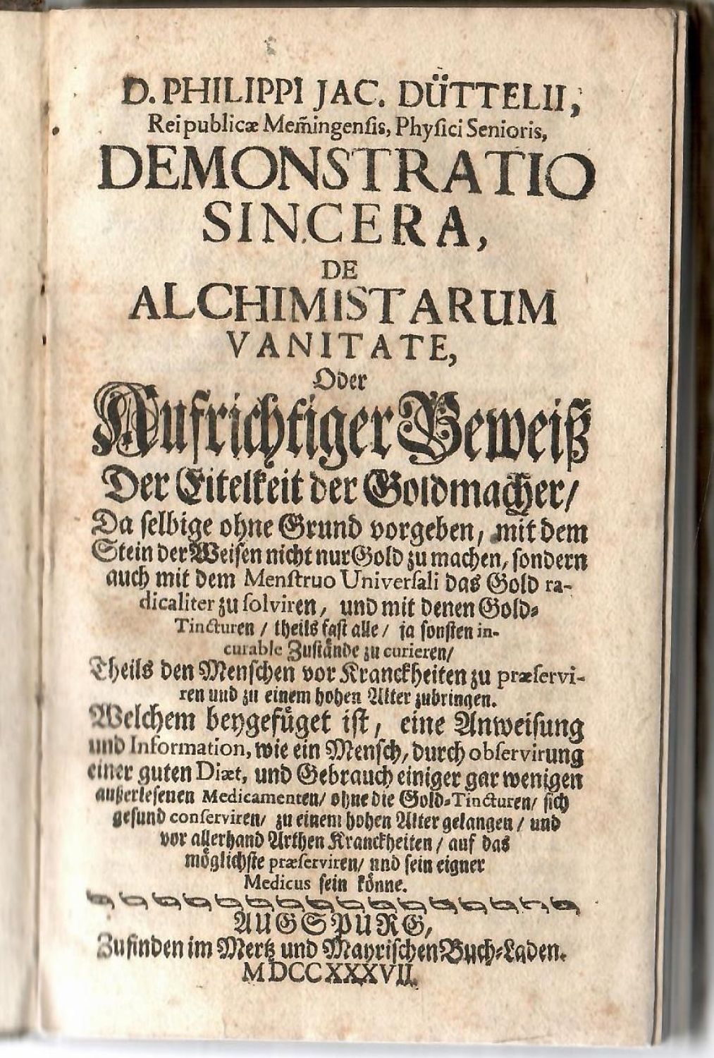 Jakob Philipp Düttel (1679 Nördlingen - 1747 Memmingen), německý lékař, v roce 1702 promoval na universitě v Halle, později působil jako městský lékař v Memmingenu. Jeho kniha je kritickým a nekompromisním vymezením vůči alchymii.