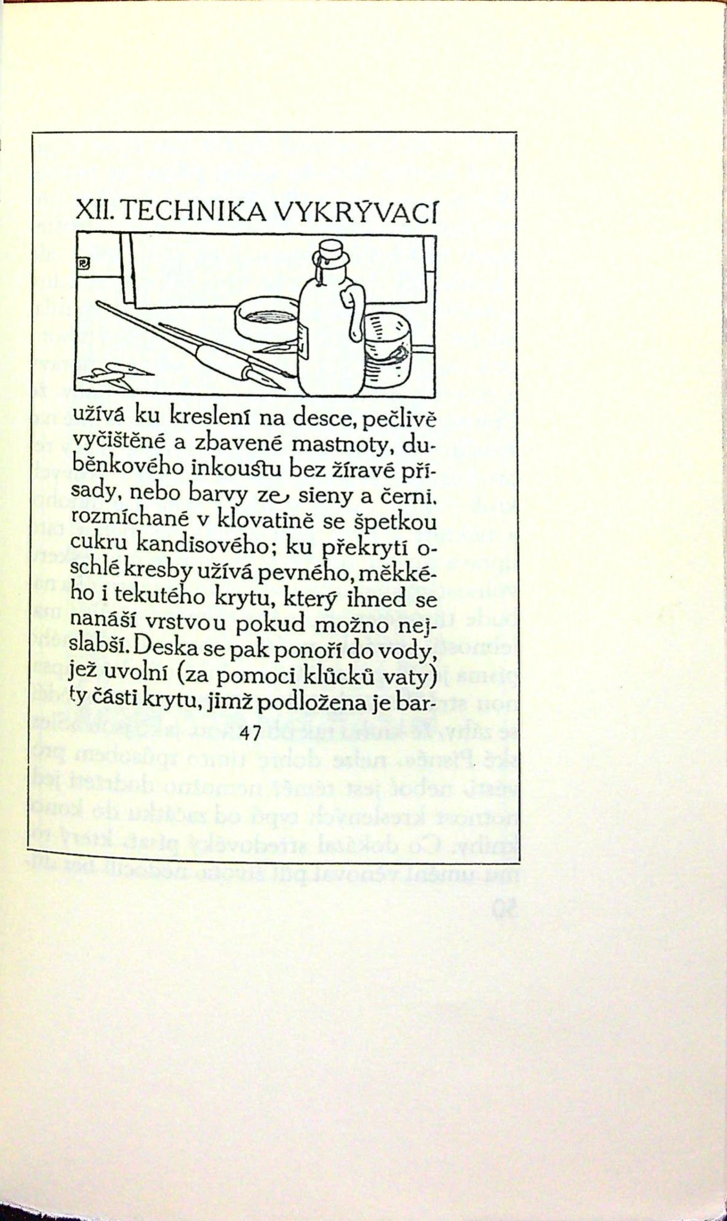 Jeden z 200 vydaných výtisků, nakladatelskou značku v titulu a tři černě tištěné plné iniciály na ilustr. pozadí zhotovil Jaroslav Benda, typograficky upravil Karel Dyrynk, kniha byla vysázena z typů písma F. W. Goudyho, které pro českou sazbu upravil a akcenty doplnil Vojtěch Preissig. Písmem z vlastní slévárny na holandském ručním papíře vytiskla Státní tiskárna. V textu řada vyobrazení, černě i barevně tištěných s ukázkami různých titulních listů, sazby, typů písma, vinět,... Za tištěnou předmluvou podpis Karla Dyrynka modrým perem.