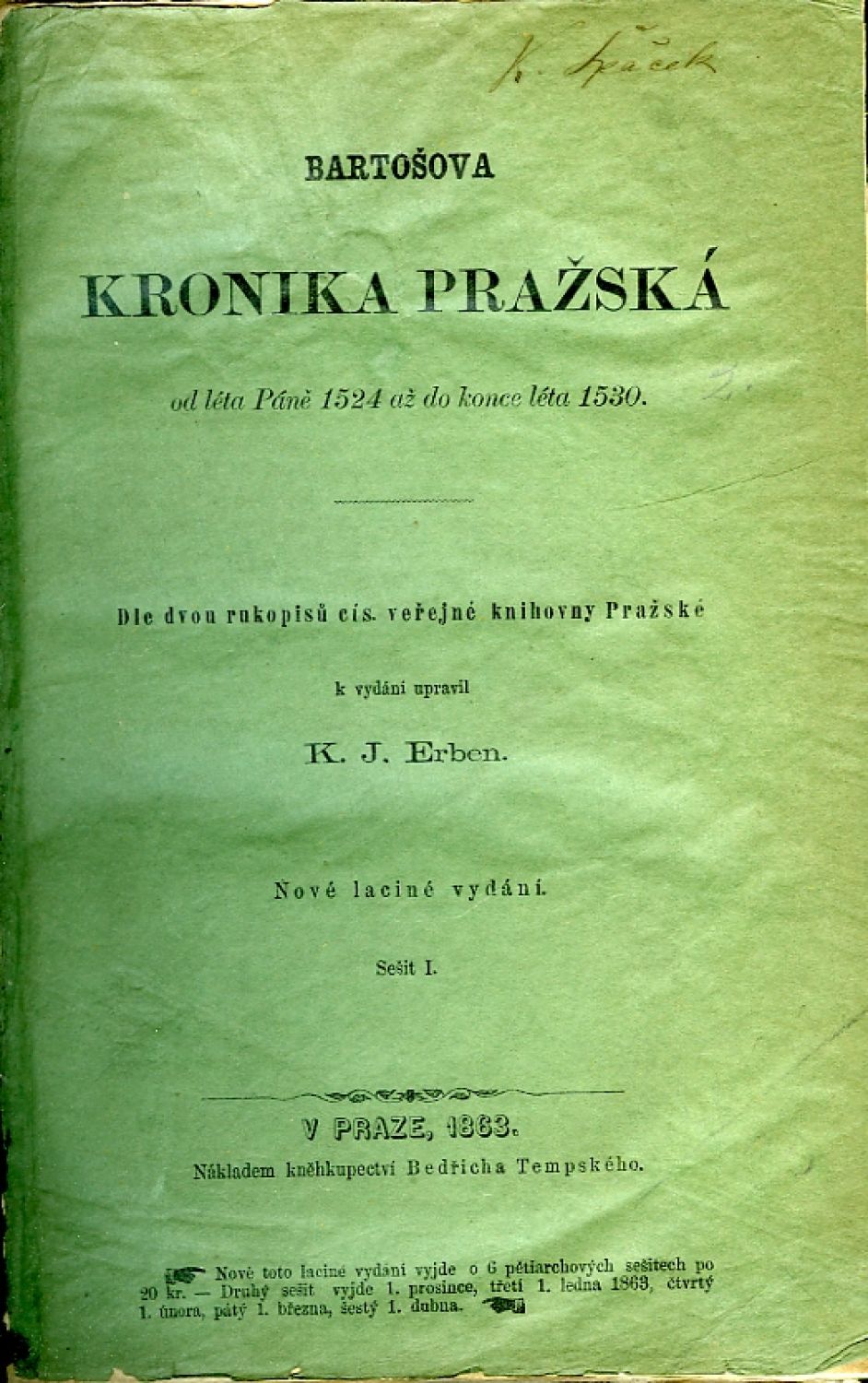 Bartošova Kronika pražská od léta Páně 1524 až do konce léta 1530. Dle dvou rukopisů cís. veřejné knihovny Pražské k vydání upravil ... Nové laciné vydání.
