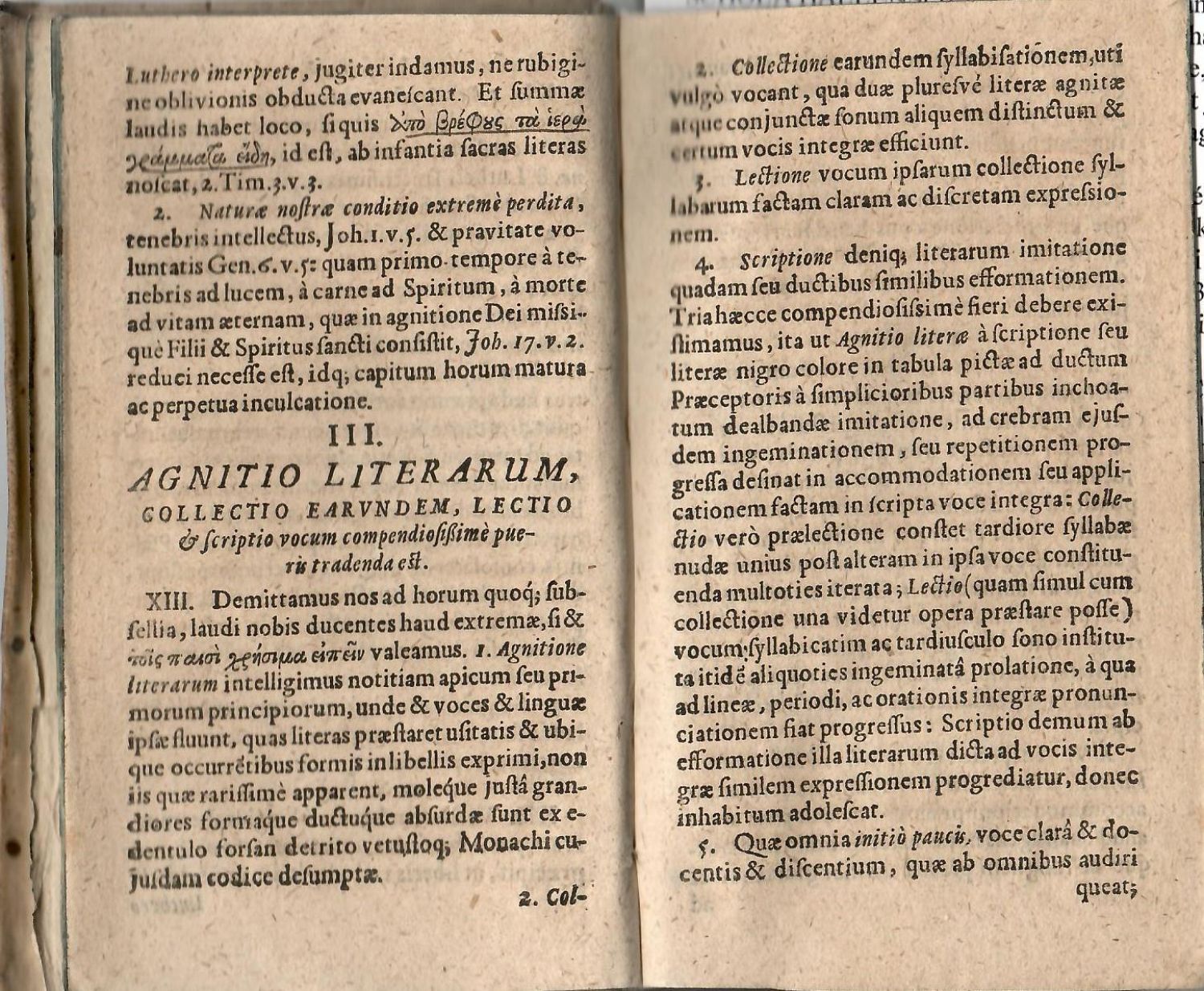 + přívazek: M. Christiano Jacobi Rochlicensi (Christian Jakob von Rochlitz): TRACTATUS PRAECOGNITORUM, De NATURA ET STUDIO INGENIARIAE, ORGANICARUM SCIENTIARUM ET ARTIUM GENETRICE AC PROPAGATRICE. Concinnatus et publicatus á CHRISTIANO JACOBI Rochlicensi p. t. Ecclesiaste in Delau. Jena, Georg Sengenwald, 1649, [XVI]-104-[VIII] str., 1. vydání, latinský text antikvou, řecký alfabetou, živá záhlaví od sazby oddělená jednoduchou linkou, tištěné poznámky po stranách, pásové vlysy, vstupní konturová iniciála na rostlinném pozadí zalomená do výše 5 řádků, versálkami tištěné nadpisy jednotlivých kapitol, koncová viněta. Na konci doprovodného textu za předmluvou autorovou latinská báseň o Jacobim z pera Christiana Gueintze.