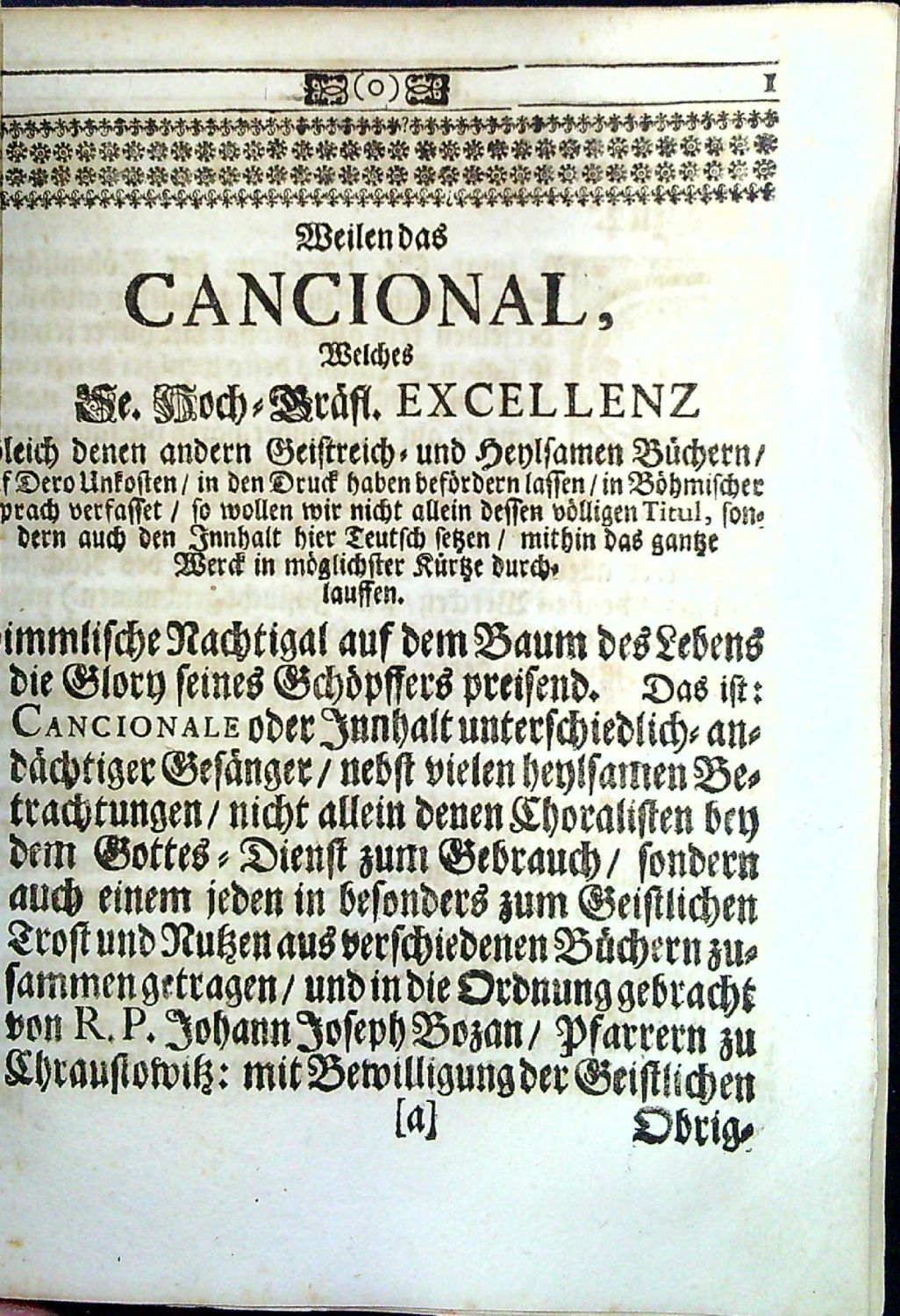 + přívazky (Mezi str. 48r-49 "Weilen das CANCIONAL, Welches Se. Hoch=Gräfl. EXCELLENZ...", "Schreiben von Sr. Excell. Hn. Grafen von Sporck an ... de dato Bon Repos den .. Jan. Ao. 1720", "Graf Sporkisches MEMORIAL ...", "Schreiben von Sr. Excell. Hn. Grafen von Sporck an einen gewiesen Cavalier in Wien ... 5. Decemb. 1719", "Kurtze Erzehlung derer vornehmsten Gravaminum, worüber Se. Excellenz, Herr Graf von Sporck ...", "Das letzte an Ihro Kayserl. Majestät abgeschichte Memorial --- 20. April 1720", "Ich habe/ grosser Graff/ ...Ja/wo der Nahme Sporck in Büchern wird genennet/ da schreibt, man Dessen Ruhm auf alle Blätter an, L.A.K.V.R.". - Přívazky jsou bez uvedení místa tisku, tiskaře, některé s datací 1720. Dle srovnání typograf. úpravy, iniciál, písma je pravděpodobně vytiskl též van der Leewen v Amsterdamu (kromě závěrečného listu s oslavnou básní na hraběte Šporka).