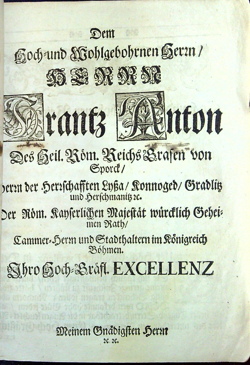 Leben Eines Herzlichen Bildes Wahrer und rechtschaffener Frömmigkeit / Welches GOTT in dem Königreich Böhmen in der hohen Person Sr. Hoch=Gräfl. EXCELLENZ, HERRN Herrn Frantz Antoni/ Des H. Röm. Reichs Grafen von Sporck/ Herz der Herzschafft Lyssa / Gradlitz / Konoged und Herschmanitz etc. Der Röm. Kayserl. Majestät würcklichen Geheimden Rath/ Cammerern und Stadthaltern des Königreichs Böhmen etc. Als einen Spiegel reiner Gottes=Furcht/ allen Frommen zu einem Beyspiel aufgerichtet hat. entworffen durch Ferdinand van der Roxas. ...