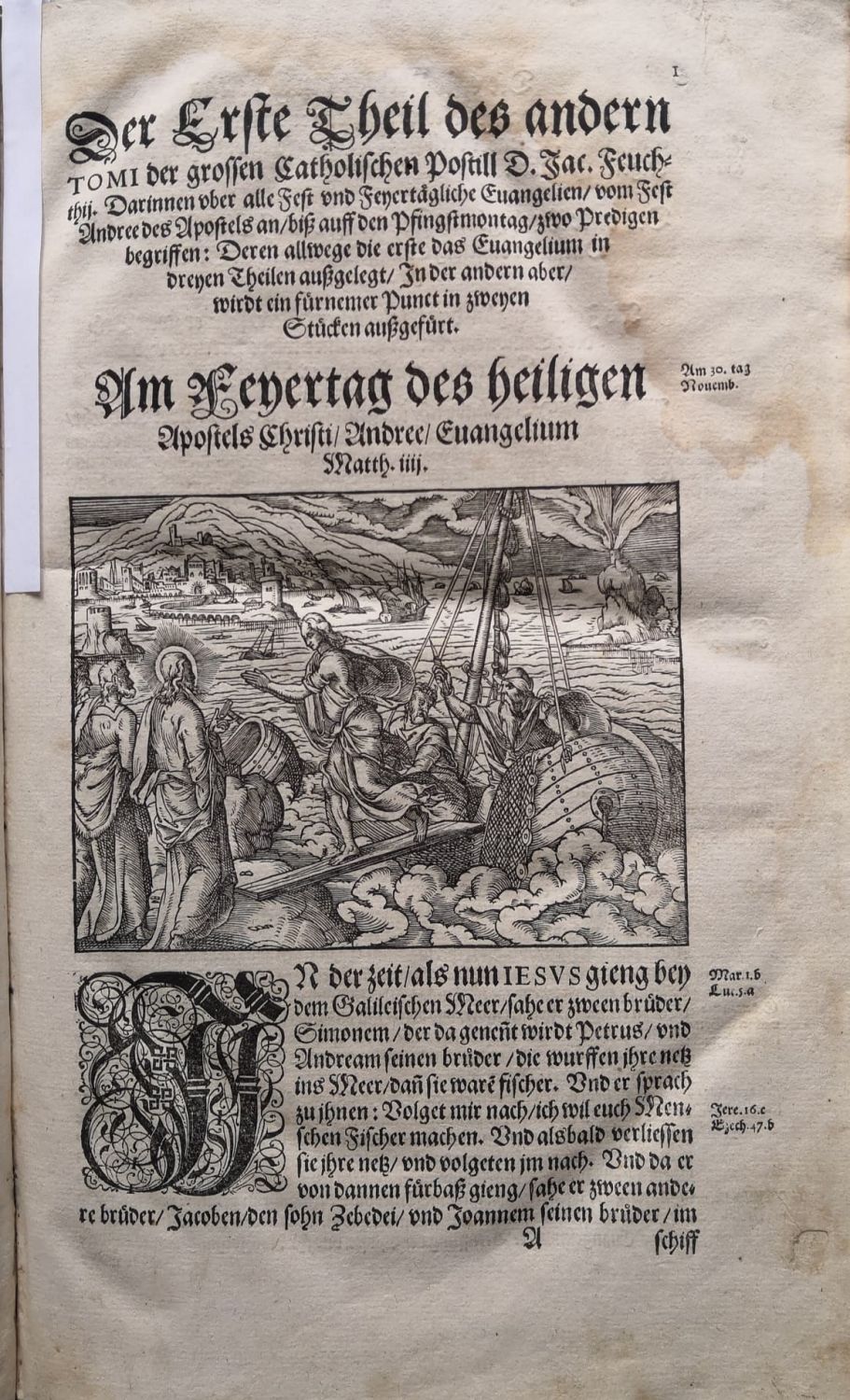 POSTILLA CATHOLICA Euangeliorum de Sanctis totius Anni. Das ist: Catholische Außlegung aller Fest und feyertäglichen Euangelien durch der gantze Jar. Darinnen uber jede Euangelien zwo Predigen begriffen. Deren allwegen die erste, das Euangelium in dreen Stücken abgehandlet: In der andern aber, wirdt ein fürnemer Punct jeder Euangelien, je den Glauben, je das Leben betreffend, in zweyen Theilen außgefürt. Sampt neuen Passionpredigen. Geprediget, nun aber GOTT dem Allmechtigen zu Lob und ehren, Röm. Keys. May. zu allergnedigstem Wolgefallen, und allen den jenigen so ernstlich Lust zur Wahrheit haben zu gütem, in offentlichen Druck verfertiget . Durch Jakobum Feuchthium, Episcopum Naturensem, Bambergischen Weyhebischouen, Canonie. daselbsten bey S. Stephan, der H. Schrifft D. etc. Getheilt in Drey Theil. Der Erste Theil des andern TOMI begreisst alle Euangelien vom Apostel Andrea an, biß auff den Pfingstmontag.