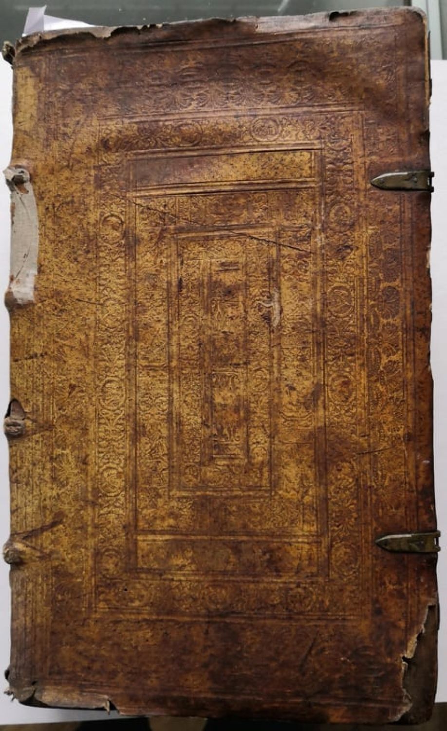 Dobová renesanční vazba. Dřevěné desky potažené světlou vepřovicí zdobenou slepotiskem. Dvojitý rám, vnější zdobený rostlinným ornamentem, vnitřní bustami světců a církevních otců, ve hřbetu 4 vazy, na přední desce původní kovové úchyty. Vazba ohmataná a odřená, při spodním okraji přední desky chybí kousek koženého pokryvu, pokryv na desce zadní potrhaný, na několika místech proděravělý s chybící kousky kůže. Na předním přídeští provenienční přípis ze 17. století ("Adversis patientia Vinco S. Joannis Grebelii de Lübenwerda Comparavit nuc Vienna 3 1/2 fl. Anno 80. Adiutorium nostrum in no[m]e D[omi]ni cui fecit coelum et terra[m]. Psal[m] 123". Na tit. listu provenienční zápis na nalepeném lístku: "Dieses Buch habe ich, Andreas Josephus Lambser damahliger Pfarer in Schonau aus der ?? Fundation vor Katholische Bibl dem Michael Haberlandt verkauphet im Jahr 1714 d. 24 Maij Andreas Josephus Lambster Pfarer in Schonau". Při levém okraji na nepotištěném místě chybí kus papíru o cca rozměru 25 x 35 mm, přelepeno kouskem papíru.