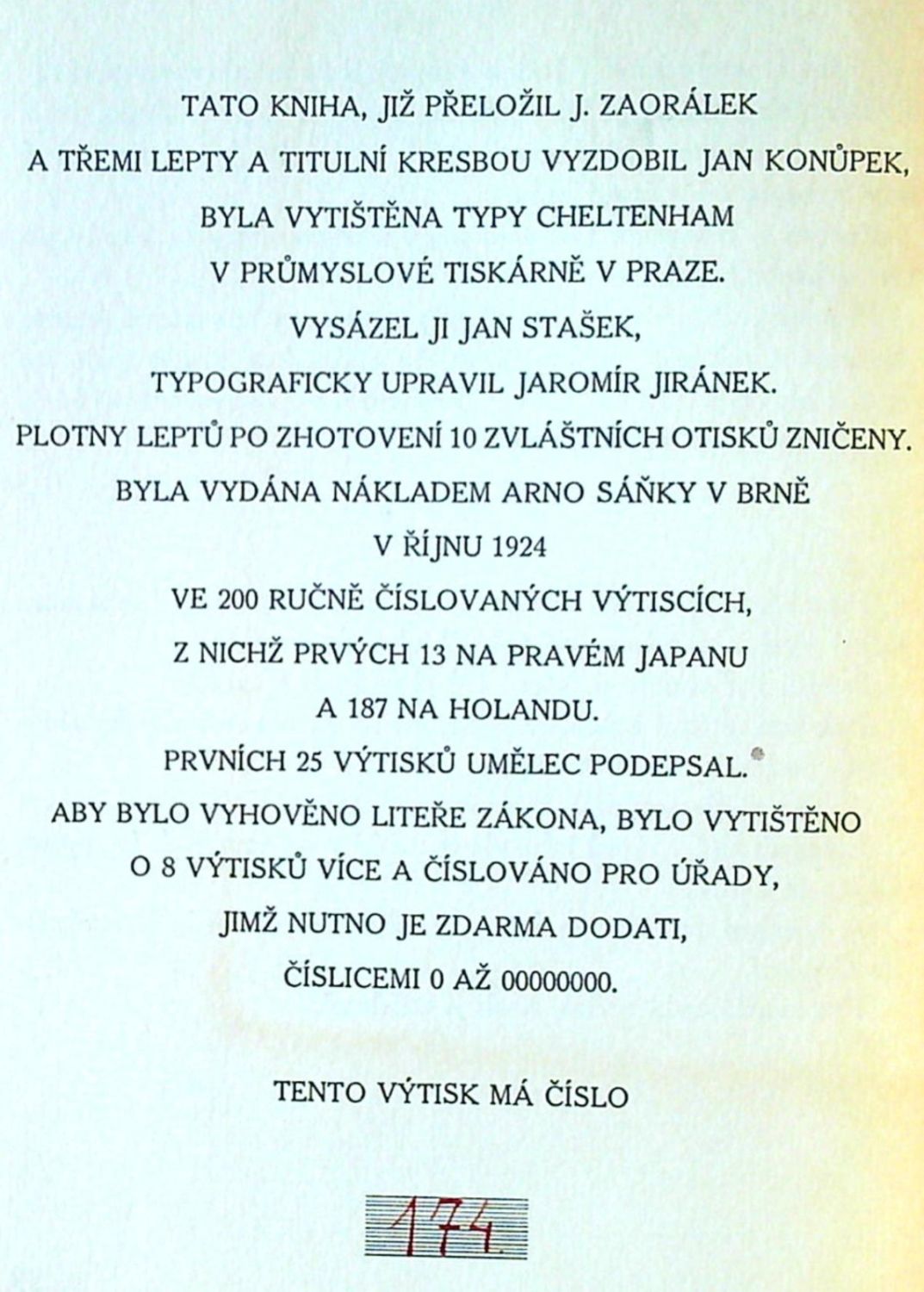 Exemplář č. 174 ze 187 výtisků tištěných na Holandu. Přeložil Jaroslav Zaorálek. Kniha byla vytištěna typy písma Cheltenham v Průmyslové tiskárně v Praze, knihu vysázel Jan Stašek a typograficky upravil Jaromír Jiránek. Původní papírová obálka, při okrajích lehce pomačkaná, při horním okraji hřbetu mírně natržená.