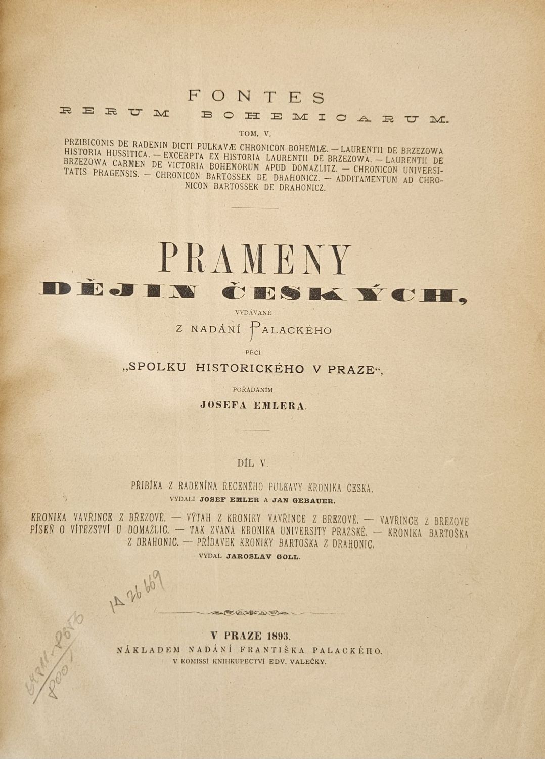 Fontes rerum bohemicarum. Tom. V. ... Prameny dějin českých, vydávané ... péčí "Spolku historického v Praze", pořádáním Josefa Emlera. Díl V. - Přibíka z Radenína Pulkavy Kronika česká, Kronika Vavřince z Březové, Výtah z Kroniky Vavřince z Březové, Vavřince z Březové Píseň o vítězství u Domažlic, tak zvaná Kronika university pražské, Kronika Bartoška z Drahonic, přídavek Kroniky Bartoška z Drahonic. (vydal Jaroslav Goll).
