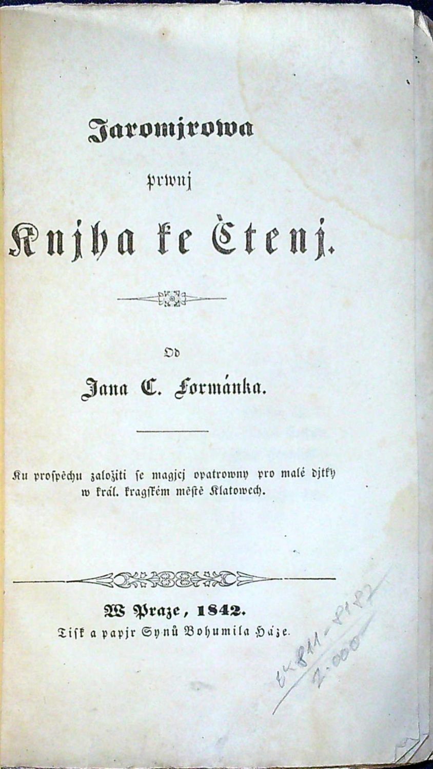 Jan Čechomil Formánek-Činoveský (12.10. 1809 Klatovy - 11.4. 1878 Tábor), studoval nejprve filosofii a poté práva. Od roku 1834 působil jako podučitel na hlavní škole v Klatovech, od roku 1841 na dívčí škole tamtéž. Autor několika povídek a několika pedagogických spisů. - Vzácně se objevující brožurka, ve které autor formou vyprávění svému synovi popisuje 25 rozličných zvířat, ptáků a ryb.