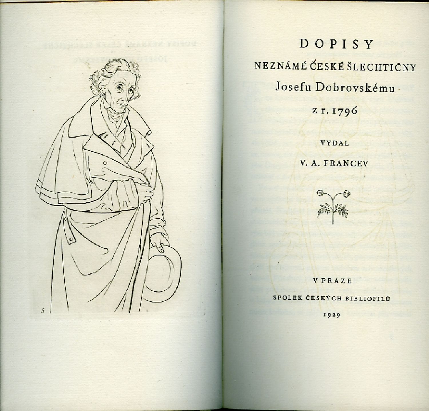 Vydáno na památku stého výročí úmrtí Dobrovského jako neprodejná prémie pro členy SČB v nákladu 600 výt. Text, zrevidovaný a s předmluvou prof. Franceva, typograficky upravil M. Kaláb, vytiskla Průmyslová tiskárna na van Gelderu. - Individuální vazba s deskami potaženými škrobovým papírem, pergamenový hřbet se zlac. věcným názvem, zlac. svrchní ořízka; přední strana pův. obálky přivázána. Desky mírně prohnuté, jinak výborný stav.