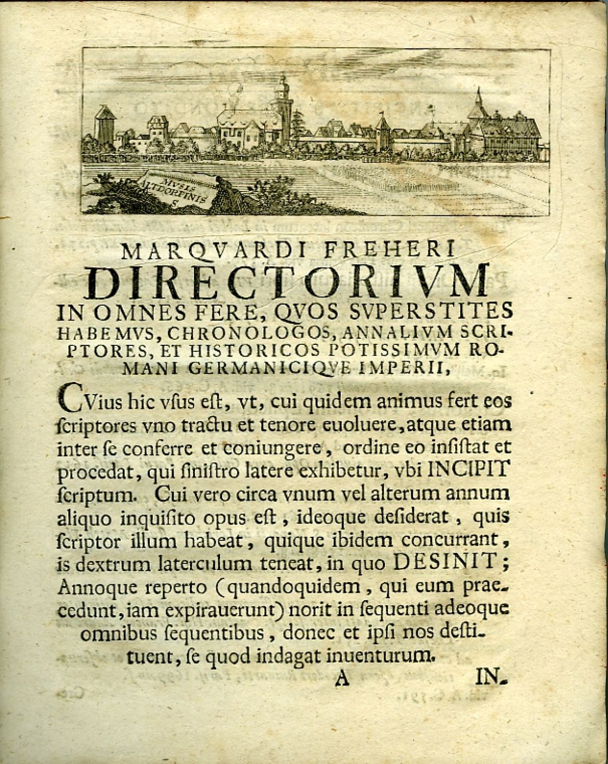 MARQVARDI FREHERI DIRECTORIVM IN OMNES FERE, QVOS SVPERSTITES HABEMVS CHRONOLOGOS, ANNALIVM SCRIPTORES ET HISTORICOS POTISSIMVM ROMANI GERMANICIQVE IMPERII. RECOGNOVIT ET AVXIT IO. DAVID KOELERVS, HIST. ET POLIT. PP. ALTORF. ET VNIV. BIBLIOTHECARIVS IN VSVM AVDIRORVM. ACCESSIT CASPARIS SAGITTARII, PP. IENENS. DISSERTATIVNCVLA DE PRAECIPVIS SCRIPTORIBVS HISTORIAE GERMANICAE.