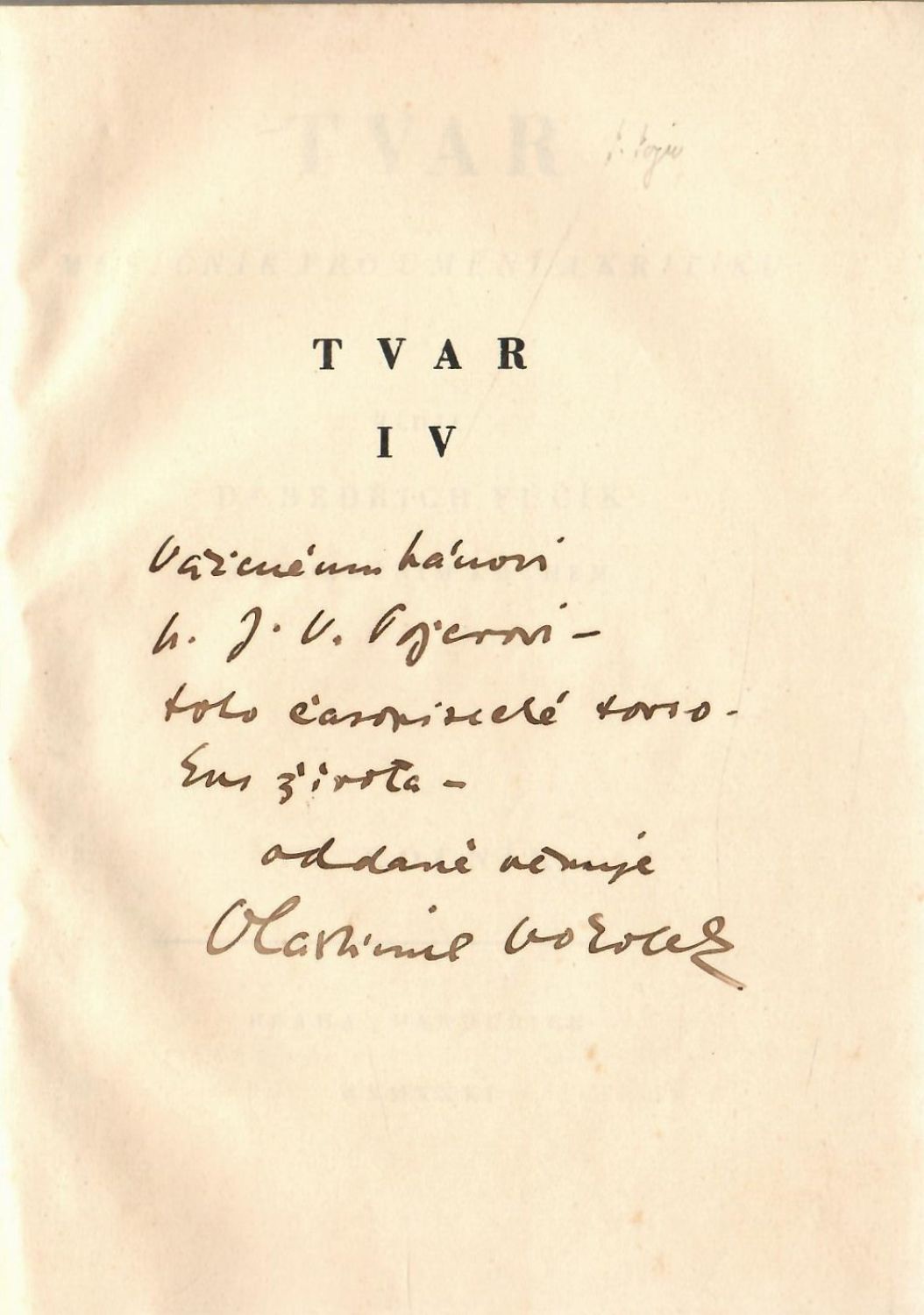 Původní papírová obálka vevázána. Na patitulu rukopisná dedikace Vlastimila Vokolka.