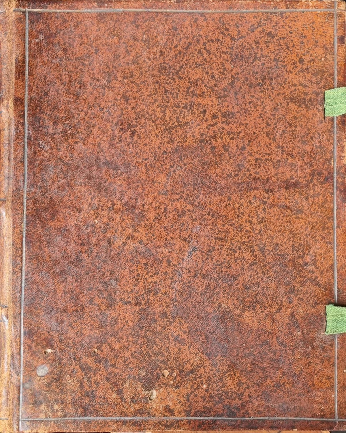 Dobová vazba z temně hnědé hověziny, ve hřbetu 3 vazy, v jednotlivých polích tlačený ornament, na obou deskách dvě původní zelené lněné vázací tkanice, stříkané ořízky. Vazba lehce ohmataná a místy mírně odřená, na obou deskách při spodním okraji několik menších dírek od červotoče. Na tit. listu začerněné staré razítko.