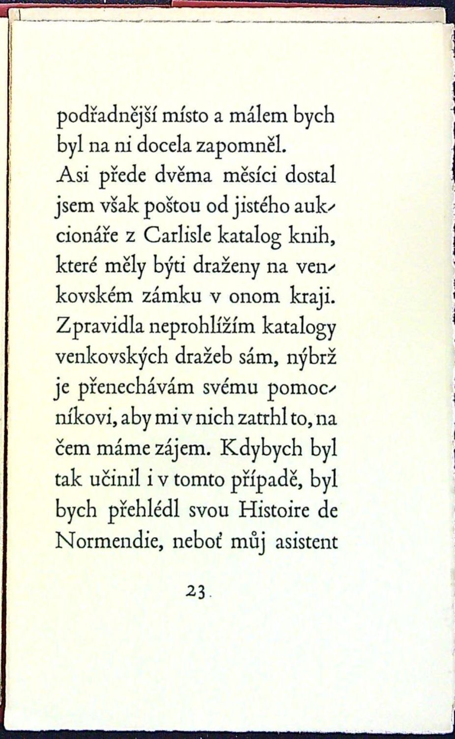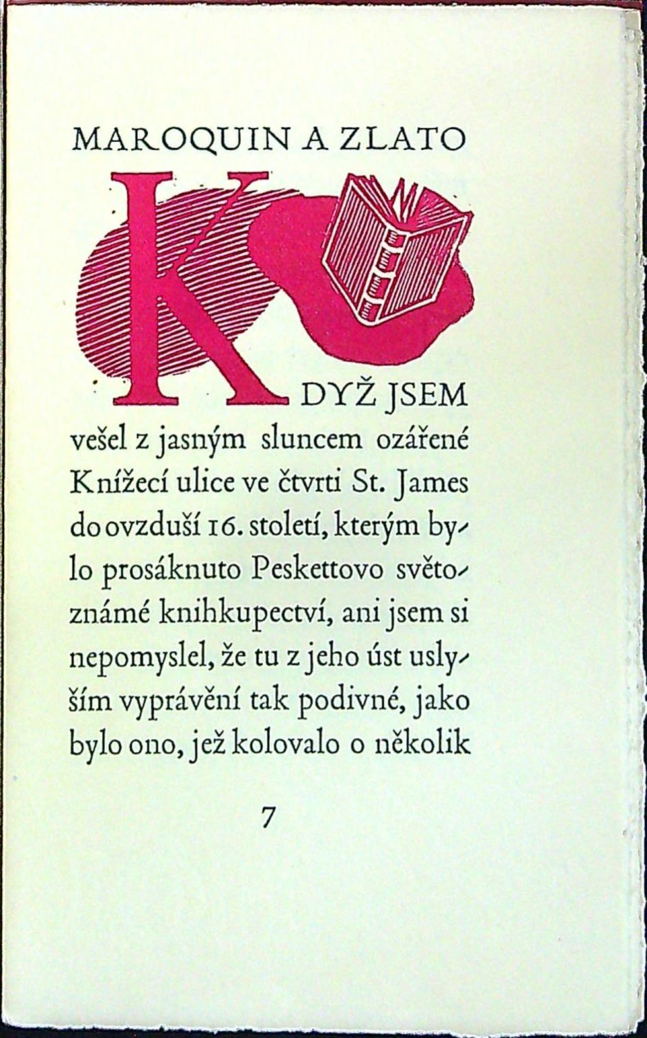 Ex. č. 25 z 53 vydaných, původními dřevoryty vyzdobil A. Burka, v tiráži jeho podpis tužkou. Tištěno na ruční papír Panekoek s filigrány. Prvních šest stran nepaginovaných. Dvoubarevně tištěný tit. list a první strana textu s iniciálou. Původní obálka z tuhého papíru s chlopněmi, ve které jsou volně vložené složené tiskové archy.