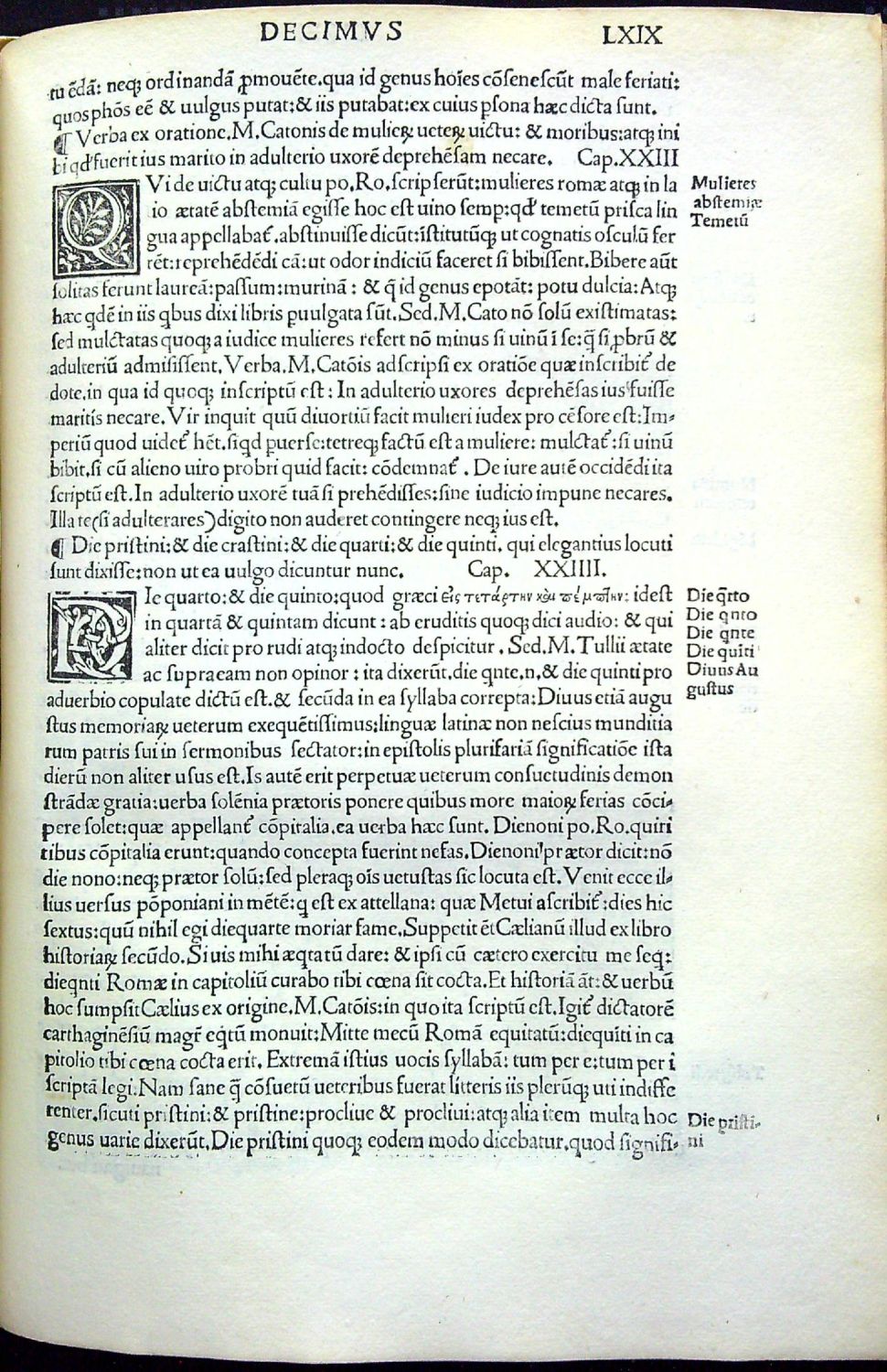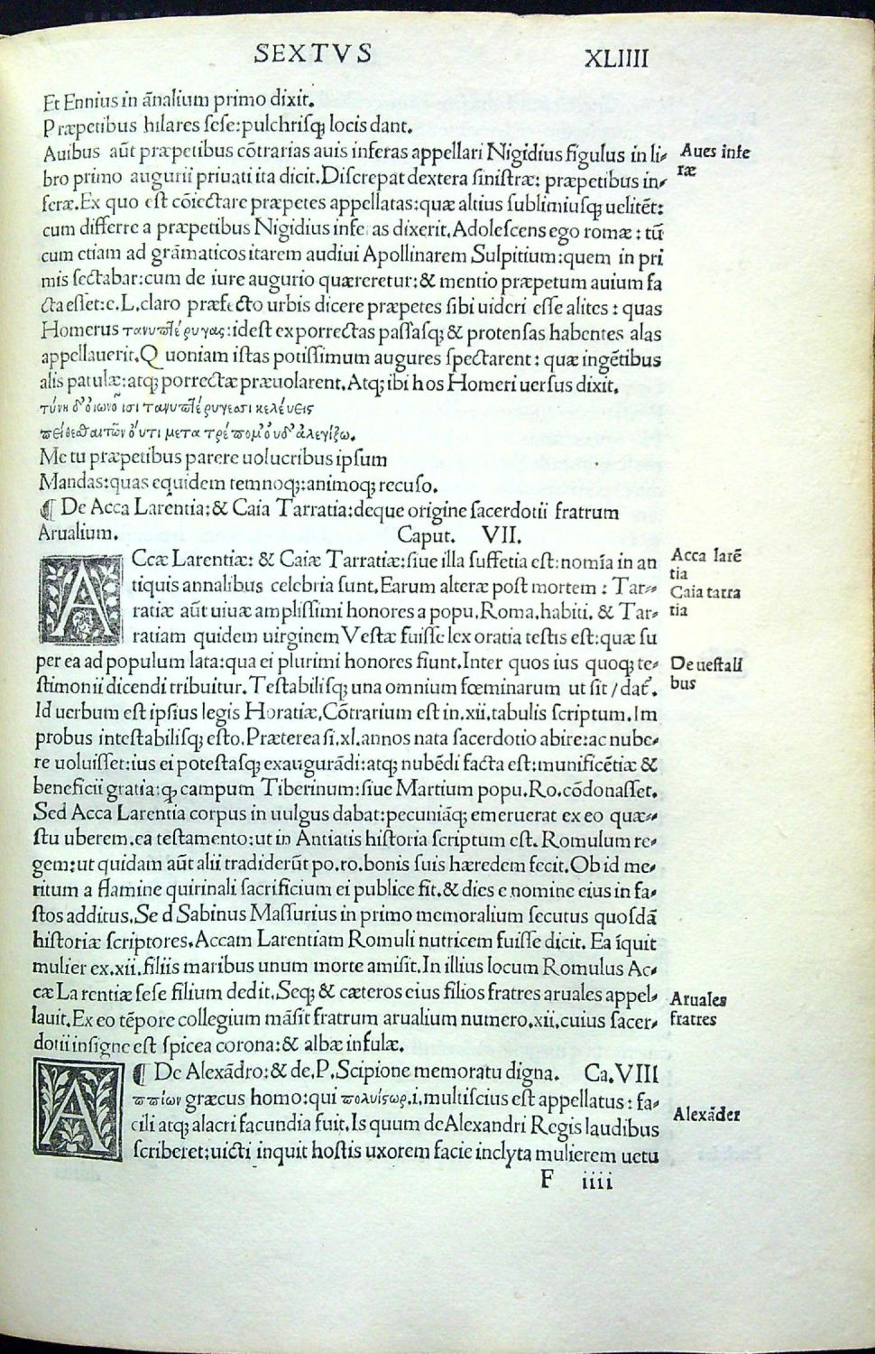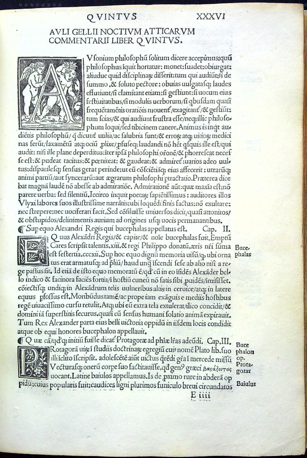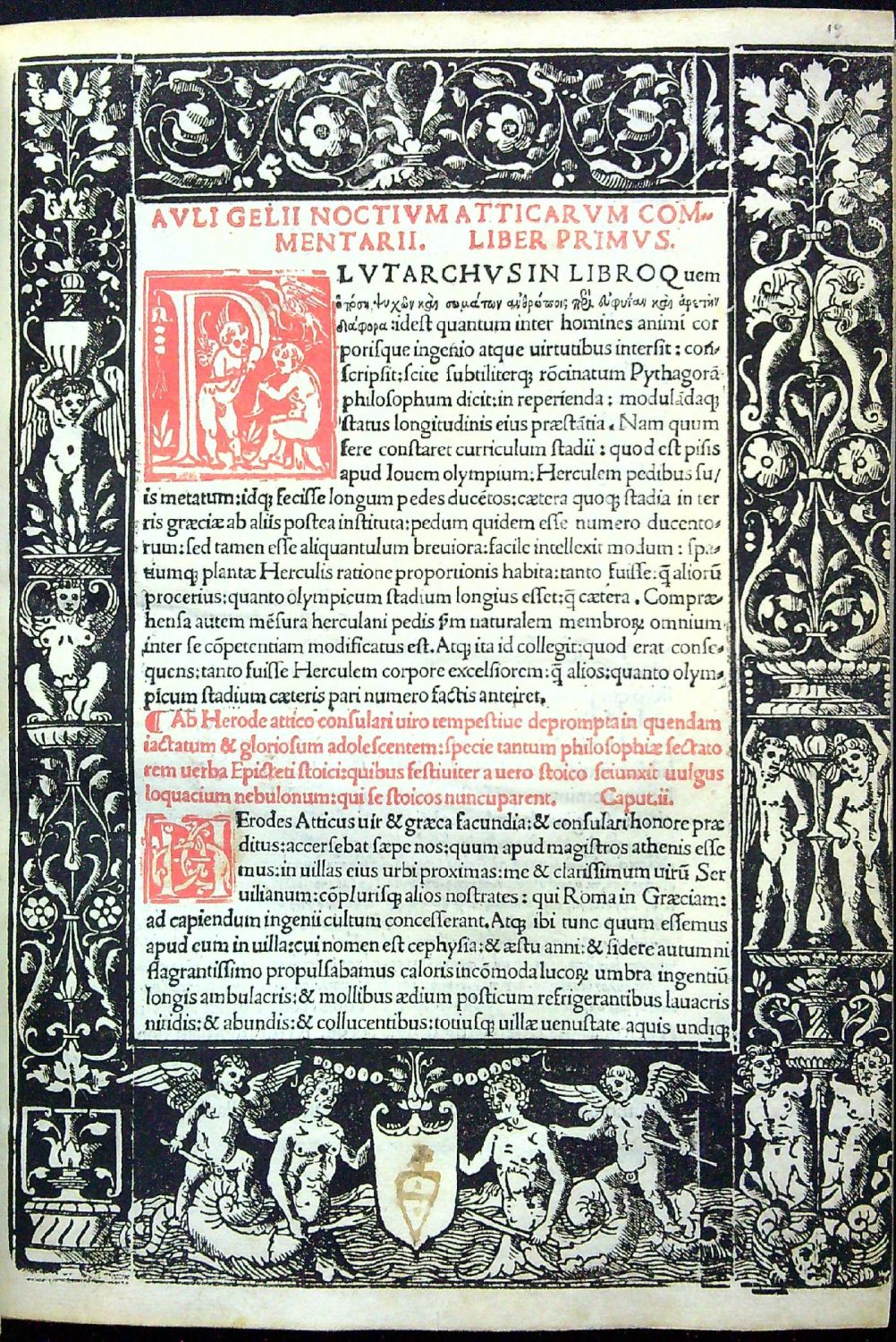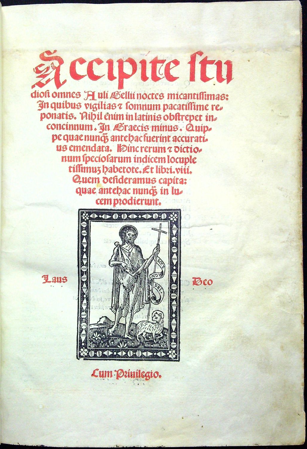 Accipite studiosi omnes Auli Gellii noctes micantissimas: In quibus vigilias [et] somnum pacatissime reponatis. Nihil enim in latinis obstrepet inconcinnum. In Graecis minus. Quippe quae nunq[ue] antehac fuerint accuratius emendata. Hinc rerum [et] dictionum speciosarum indicem locupletissimu[m] habetote. Et libri. VIII. Quem desideramus capita> quae antehac nunq[uam] in lucem prodierunt.