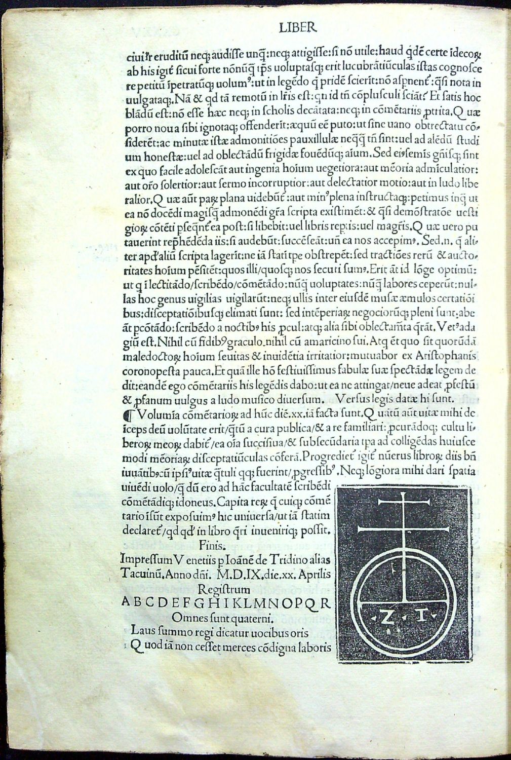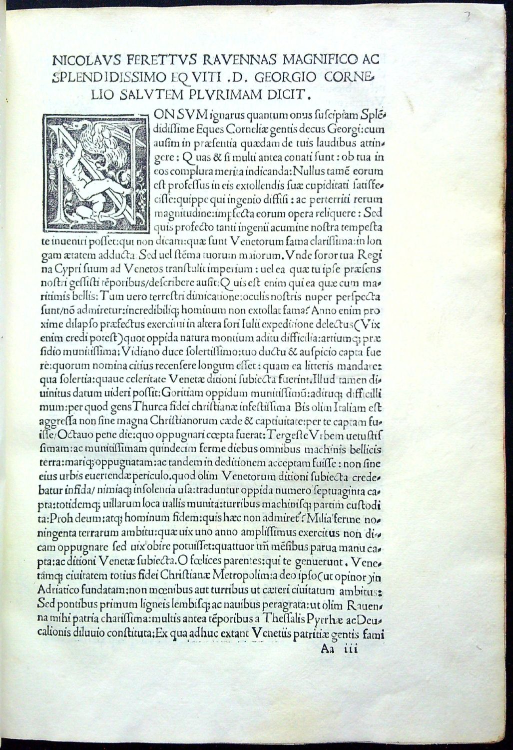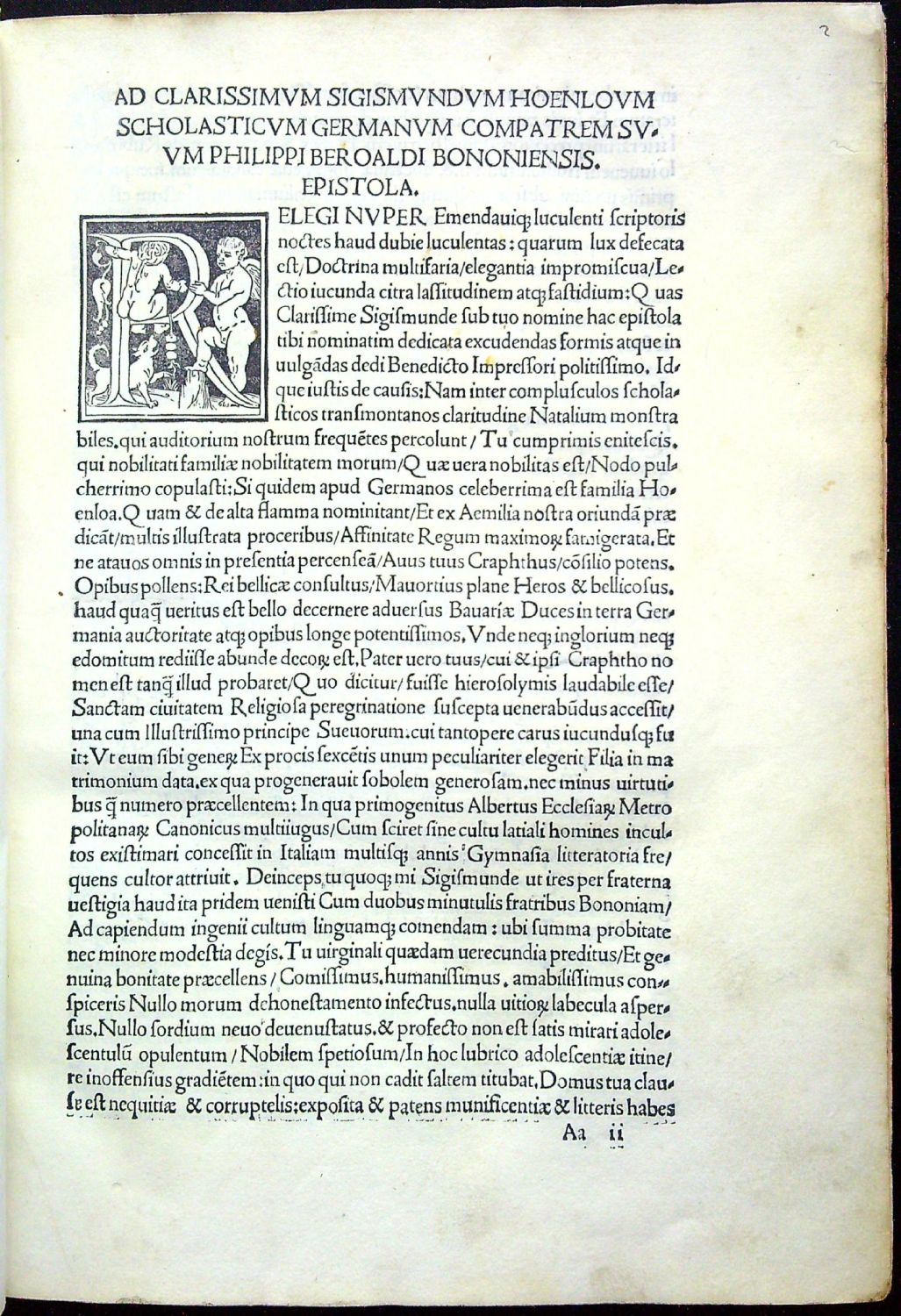 Tištěno antikvou, řecký text alfabetou, živá záhlaví, tištěné poznámky po stranách, římsky paginované listy. Červeně tištěný titulní list s černě tištěnou dřevorytovou vinětou, dvoubarevně tištěný vedlejší titulní list s dřevorytovou bordurou zdobenou ilustracemi a červeně tištěnými konturovými iniciálami ve výši 4-9 řádků. V textu řada konturových iniciál na rostlinném i ilustrativním pozadí ve výši 4-9 řádků. Impresum v kolofonu se signetem tiskařovým. V úvodu otištěný dopis Filippa Beroalda adresovaný Sigismundu von Hohenlohe, úvodním slovem opatřil Niccolo Feretti z Raveny.