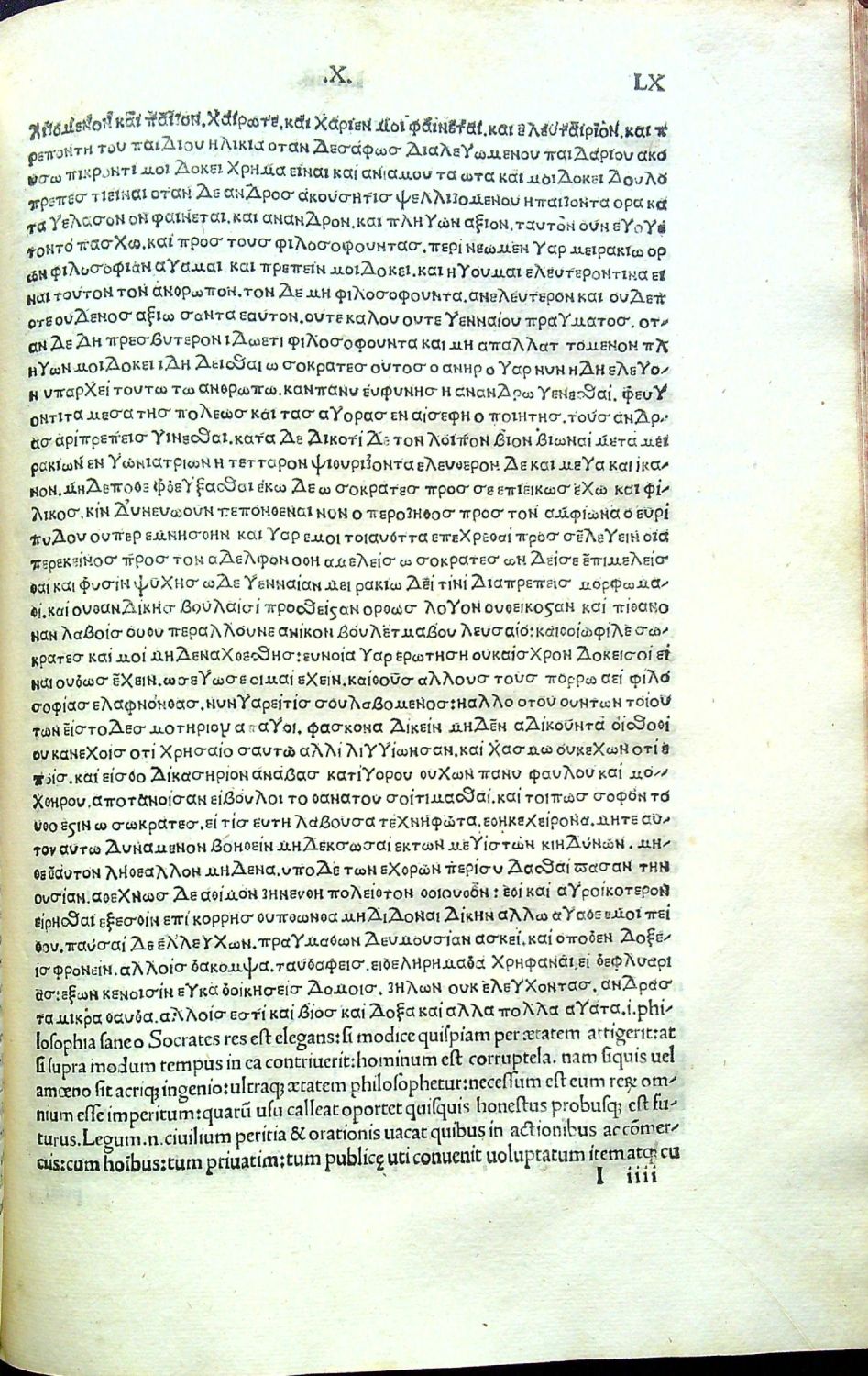 Tištěno antikvou, řecký text alfabetou, 44 řádků, živá záhlaví, tištěné poznámky po stranách, vynechaná místa pro iniciály s tištěnými předlohami pro rubrikátora, široké okraje.