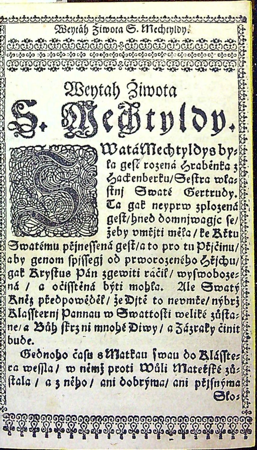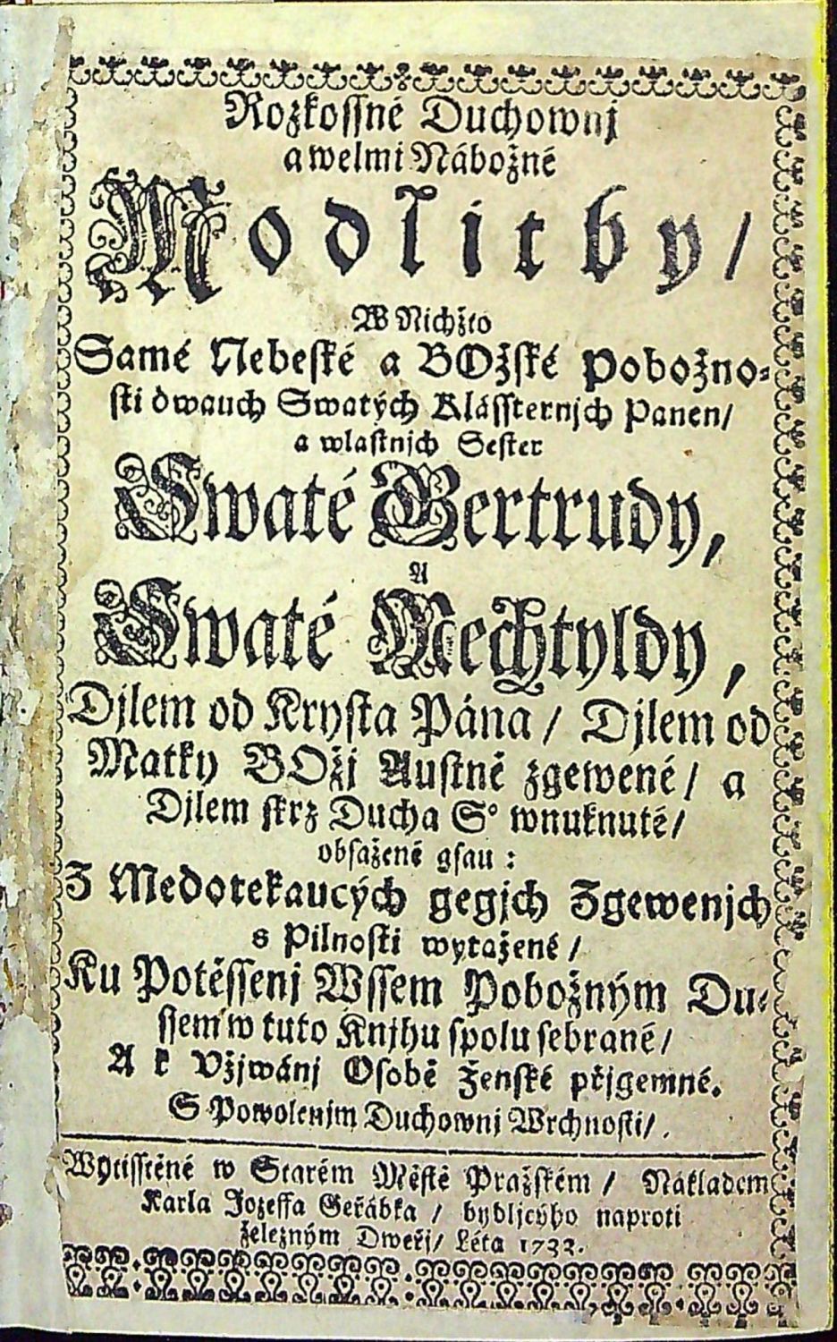 Rozkossné Duchownj a welmi Nábožné Modlitby, W Nichžto Samé Nebeské a BOžské Pobožnosti dwauch Swatých Klássternjch Panen/ a wlastnjch Sester Swaté Gertrudy, a Swaté Mechtyldy, Djlem od Krysta Pána/ Djlem od Matky BOžj Austně zgewené/ a Djlem skrz Ducha S. wnuknuté/ obsažené gsau: Z Medotekaucých gegjch Zgewenjch s Pilnosti wytažené/ Ku Potěšenj Wssem Pobožným Dussem w tuto Knjhu spolu sebrané/ A k vžjwánj Osobě Ženské přjgemné, S Powolenjm Duchownj Wrchnosti/.