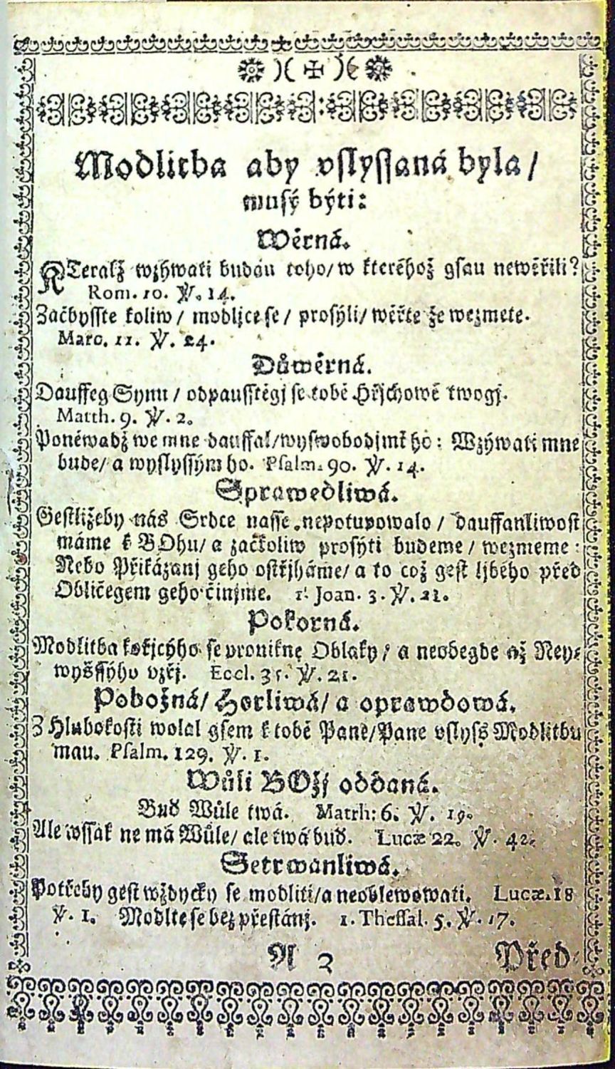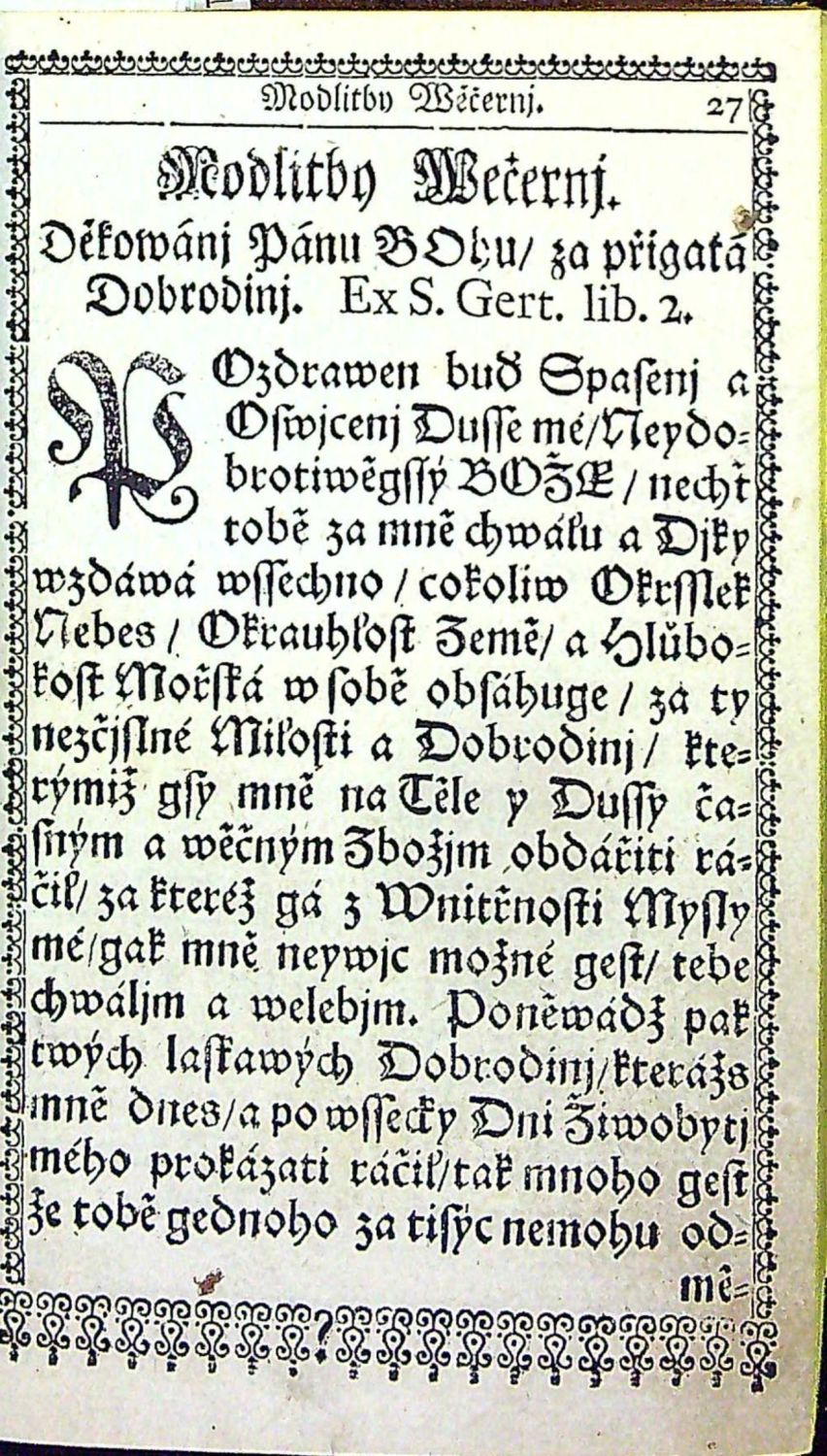 Tištěno švabachem, živá záhlaví od sazby oddělená jednoduchou linkou, text olemovaný rámečkem z ornamentů, iniciály propletené úponky zalomené do výše 2-4 řádků., plné iniciály na ornamentálním pozadsí zalomené do výše 4-6 řádků, ozdobné lišty z ornamentů, viněty, první část knihy se skládá z 12 dílů. Samostatně paginovaná druhá část s titulním listem "Welmi Užitečné A Potěssytedlné Rozmlauwánj/ O weliké Platnost a Vžitku Austnjch Modliteb/ Stůro na wětssým Djle z Zgewenj SS. Geretrudy a Mechtyldy. wytažené A Těmto Modlitbám, k obwzlásstnjmu Srdce Potěssenj. wssem Pobožným a BOhabogjcým Křestianům/ připogené".